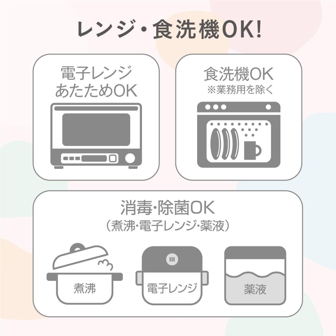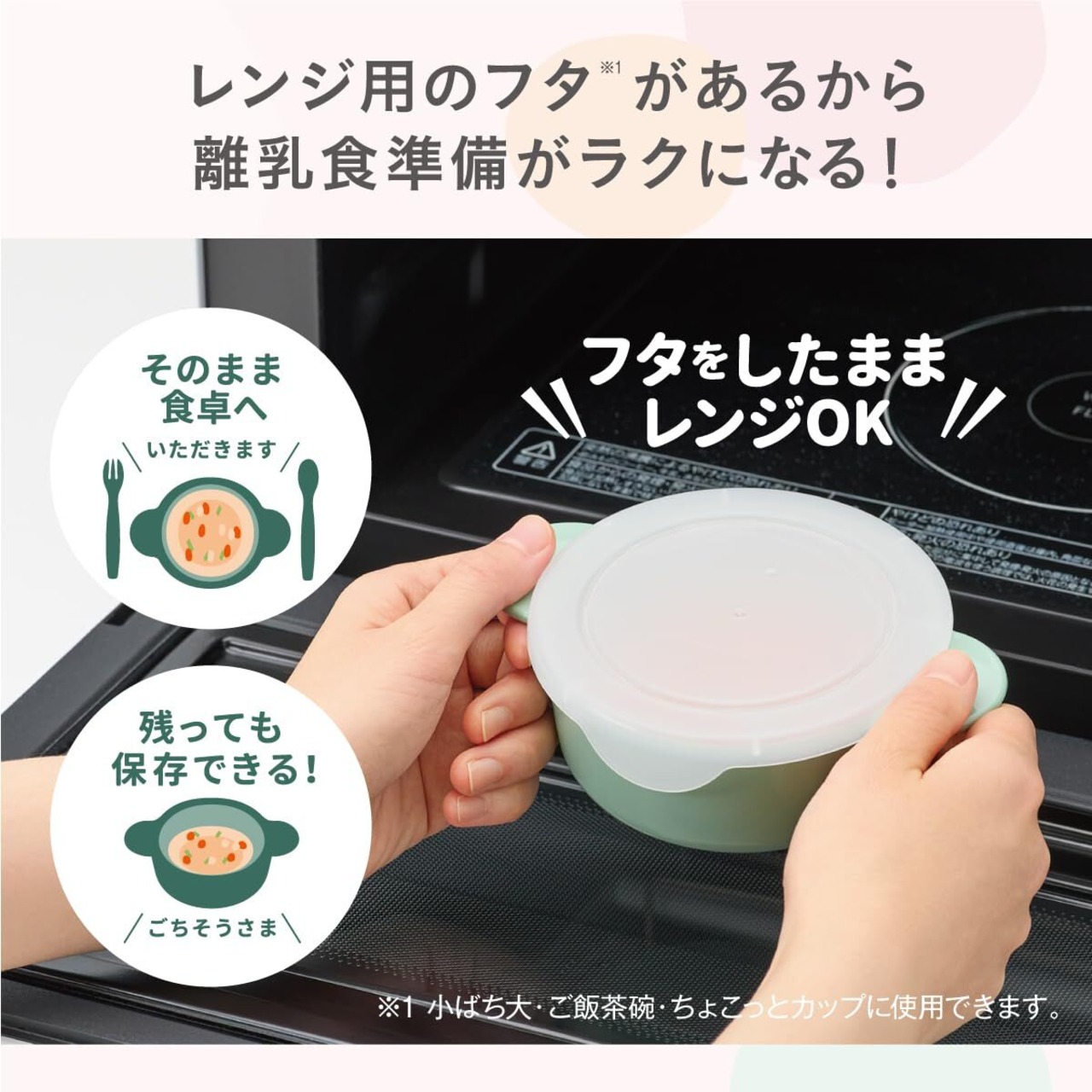 小ばち大・ご飯茶碗・ちょこっとカップに使用できる専用のフタにより、ラップ不要で、食器ごと電子レンジ加熱が可能です。フタをしたまま、白身魚や温野菜などのレンジ調理※1もできるので、洗い物が減らせて、離乳食作りの手間を省けます。※1 おかゆ・汁物・糖分油分の多い調理は除く。
