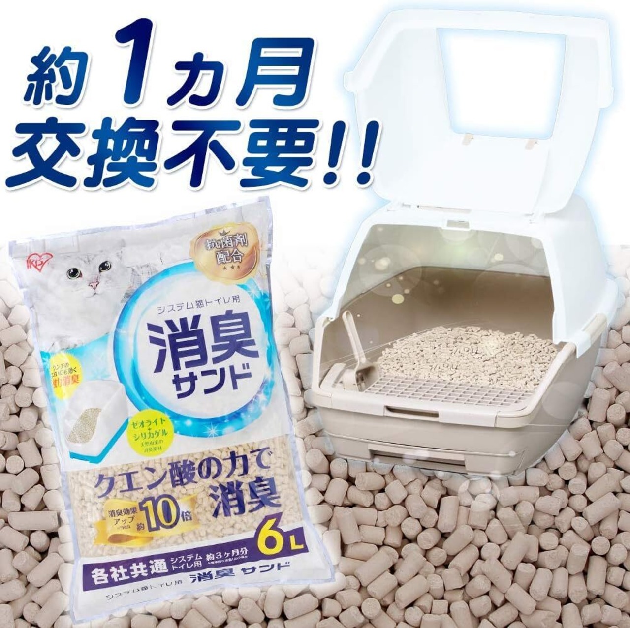 【商品説明】:クエン酸、ゼオライト、シリカゲルの3つの消臭素材でがっちり消臭。 固まらないタイプのシステムトイレ用猫砂です。 クエン酸がアンモニアを中和し、においと雑菌の繁殖を抑えます。 ゼオライトとシリカゲルでアンモニア臭を吸着し、湿気を吸収するので、トイレ内の消臭乾燥に活躍。 強力な脱臭力と抗菌力で約1ヵ月交換不要。(目安)