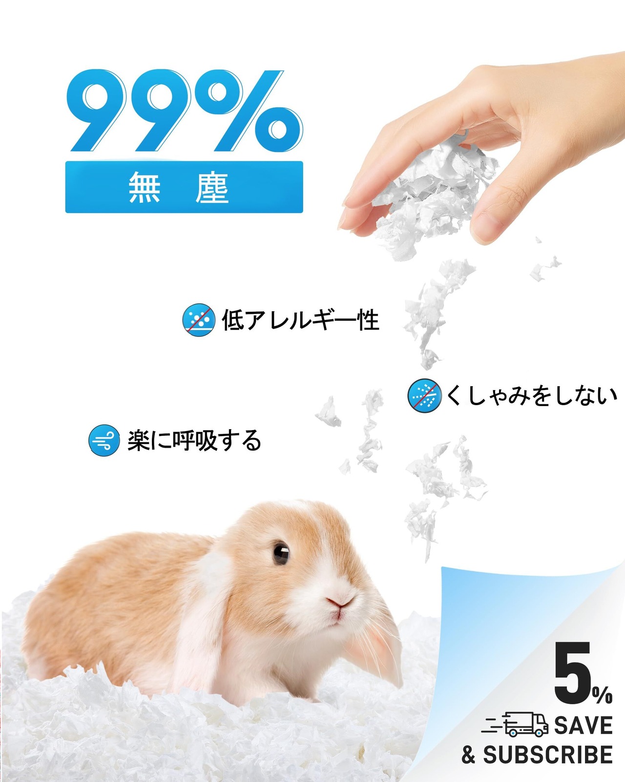 【高品質な天然素材】BUCATSTATEのハムスター床材は、FSC認証を取得した適切に管理された林場から採取された5年生の広葉樹を使用し、信頼の品質をお届けします。二次精製されたパルプを採用しているため、粉塵が少なく、通気性も抜群です。木のチップと比較して粉塵の発生がほとんどなく、優れた吸水性と消臭効果を兼ね備えています。ペットと飼い主様にやさしい低アレルギー素材です。