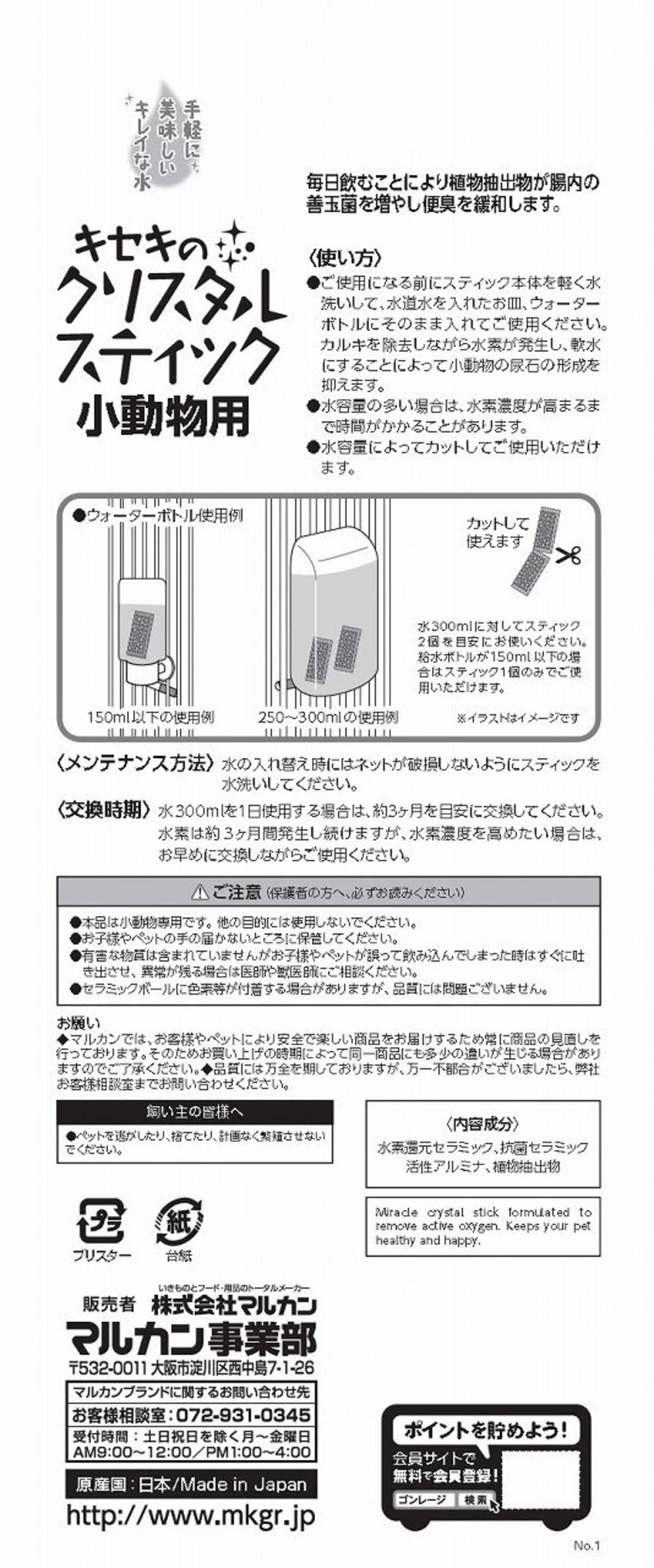 ご使用になる前にスティック本体を軽く水洗いして、水道水を入れたお皿、ウォーターボトルにそのまま入れてご使用ください。カルキを除去しながら水素が発生し、軟水にすることによって小動物の尿石の形成を抑えます。