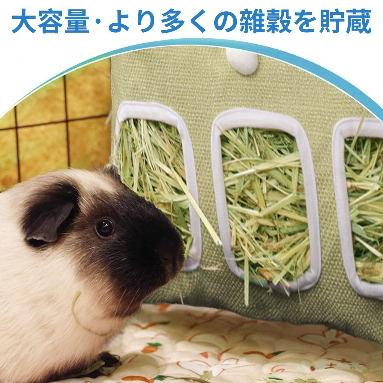 【うさぎ用給餌バッグの3穴設計】干し草の取り出しに便利な、適切なサイズの3穴取り出し口を採用しています。オープン配置タイプに比べ芝が飛び散らず、無駄なくご使用いただけます。