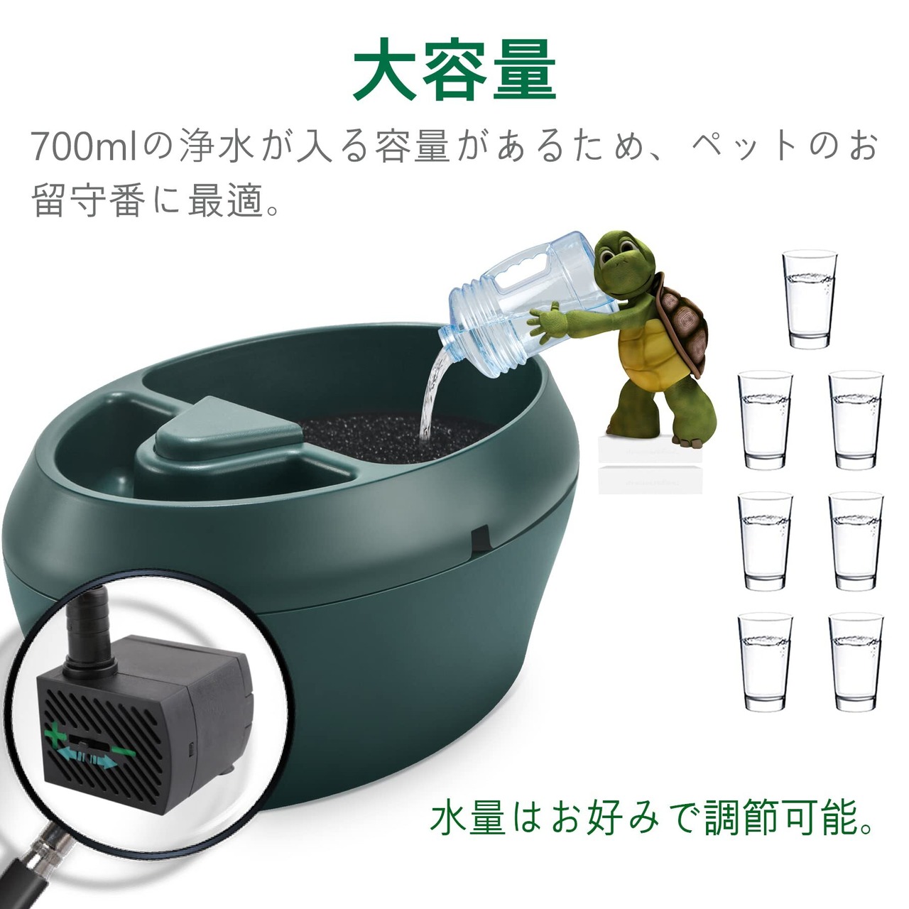 -【出水量のコントロール】亀、ヘビ、カメレオンなど爬虫類動物の生活習慣やご主人様の都合に合わせて水の落ちる量や速さを自由に調整することができます。また、カーボンパッドも付属しており、水の浄化に役立ています。(タンク容量は0.8L、週1回に清掃をお勧めします)