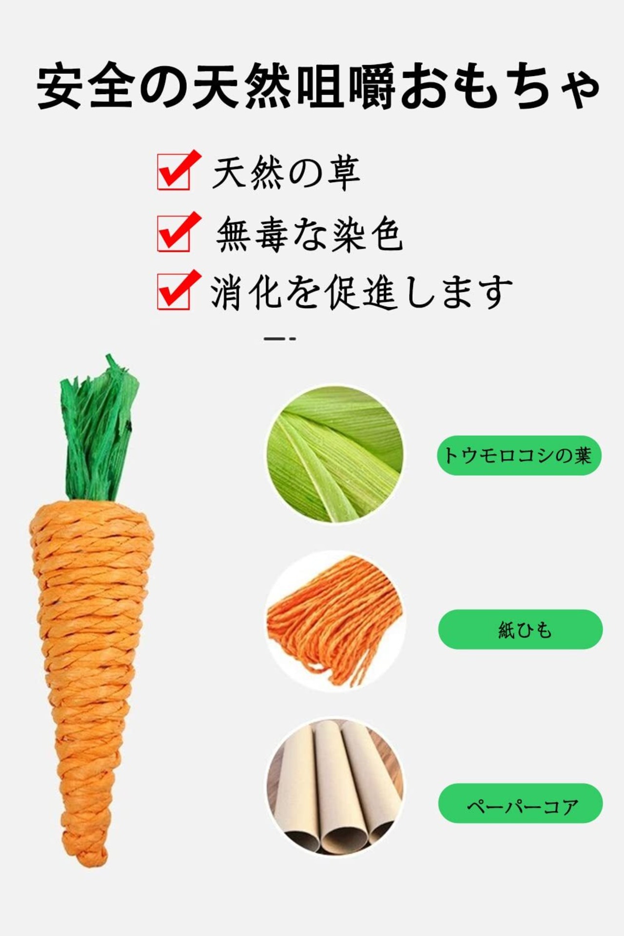 【商品詳細】小動物咀嚼玩具セットには、合計6つの天然干し草編みおもちゃ。にんじん型のおもちゃ4個、とうもろこし型のおもちゃ1個、なす型のおもちゃ1個。 【安全の天然咀嚼おもちゃ】当社の小動物おもちゃは天然の草、私たちは無毒の染色プロセスを使用しています、ハムスターの歯むつつきに耐えられ、強くて長持ちできます。 【ペットの健康を守る】何かを噛むことはハムスターのような齧歯類動物には非常に重要です。ハムスターはおもちゃを咀嚼して繊維に富んで、胃腸のうごめくことを加速することができて、消化を促進します、歯を深くきれいにすることもできます。 【楽しみをそえる】ペットは寂しい時に、あなたにペットとゆっくり遊ぶの時間がない場合に、このおもちゃと単独で遊ぶことができます。ハムスターのおもちゃは、ペットの破壊的な行動を避けます、同時に運動不足の問題やストレスを解消できます。 【幅広い用途】ウサギ、チンチラ、ハムスター、モルモット、リス、オウム、その他の小さな齧歯動物に最適で、動物をもっと楽しくすることができます。製品は手編みで、サイズに誤差があるかもしれませんが、お許しください。