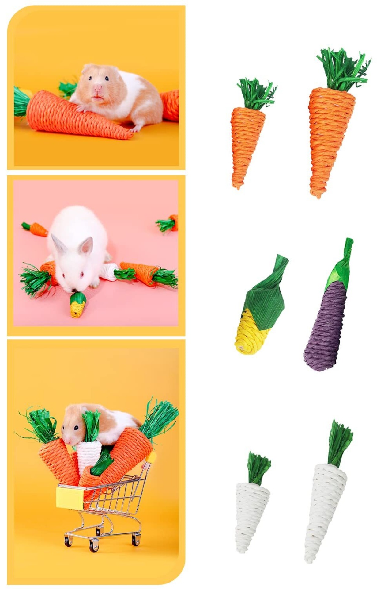 【商品詳細】小動物咀嚼玩具セットには、合計6つの天然干し草編みおもちゃ。にんじん型のおもちゃ4個、とうもろこし型のおもちゃ1個、なす型のおもちゃ1個。