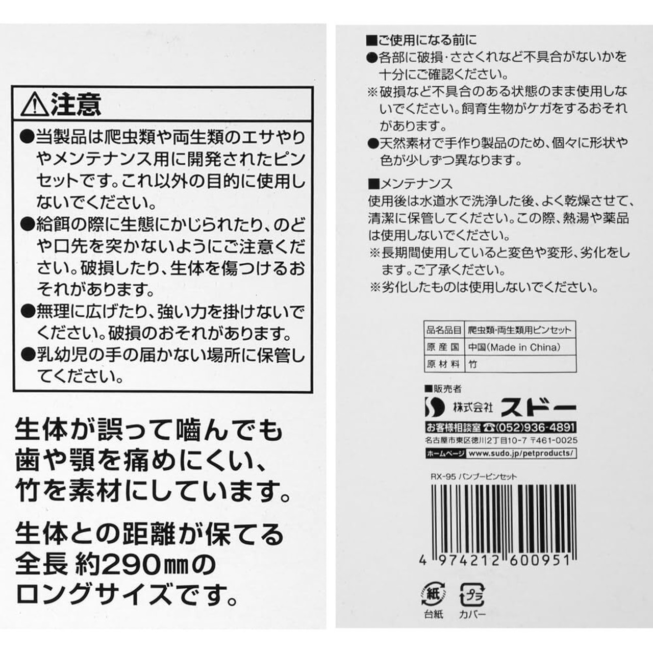 当製品は爬虫類・両生類専用の給餌、メンテナンス用のピンセットです。他の目的に使用しないでください。当製品にて体表や口等を傷つける恐れのある種類・固体には使用しないでください。当製品は強い歯や顎を持つ大型の個体に噛まれると破損する恐れがあります。ご注意ください。無理に広げたり、強い力を掛けないでください。破損や変形の恐れがあります。乳幼児の手の届かない場所に保管してください。
