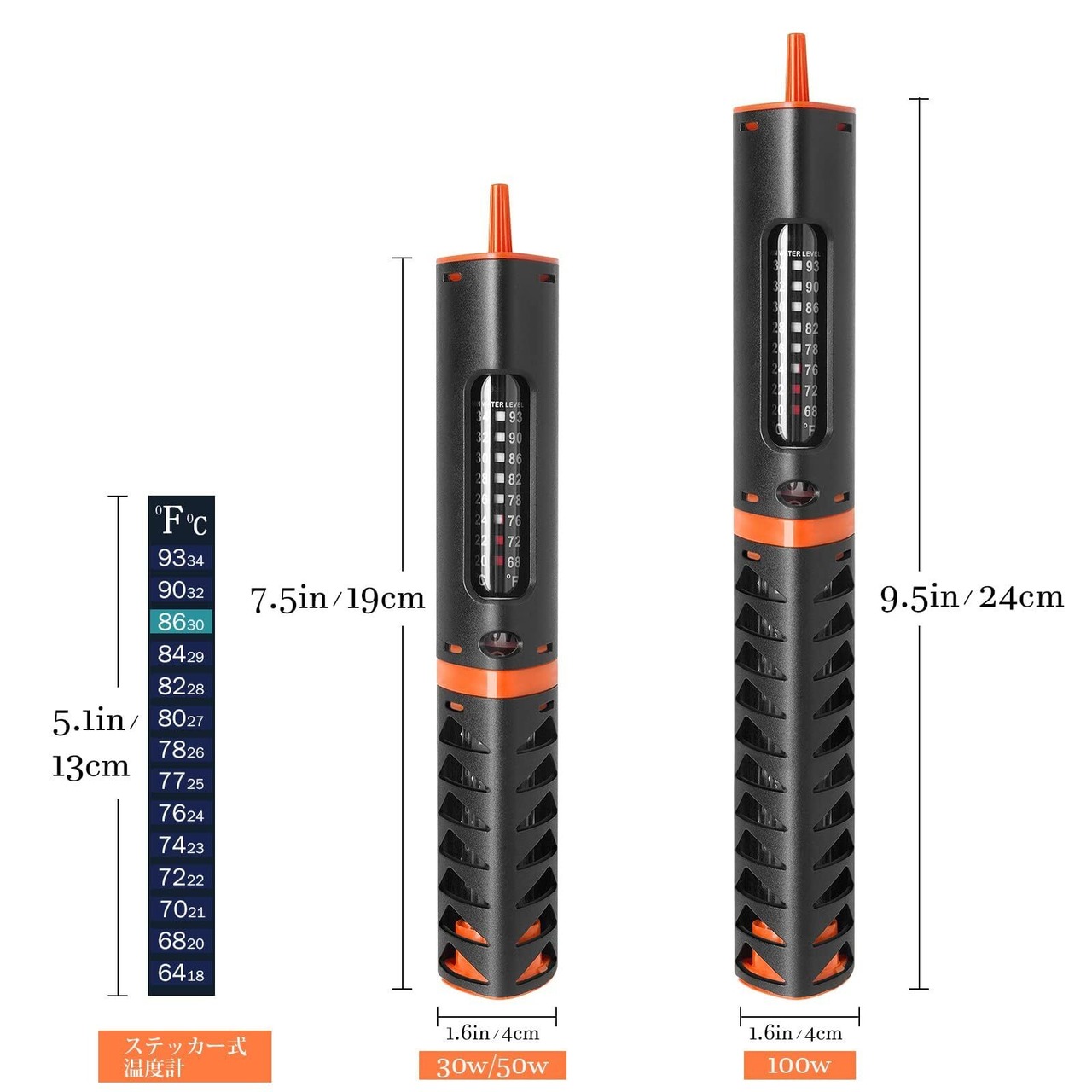 「仕様と」:50W水槽ヒーター、 19 x 4 CM / 7.5 x 1.8 IN、三つ強力な吸盤とひとつステッカー温度計付き。このヒーターに12か月のを提供します。