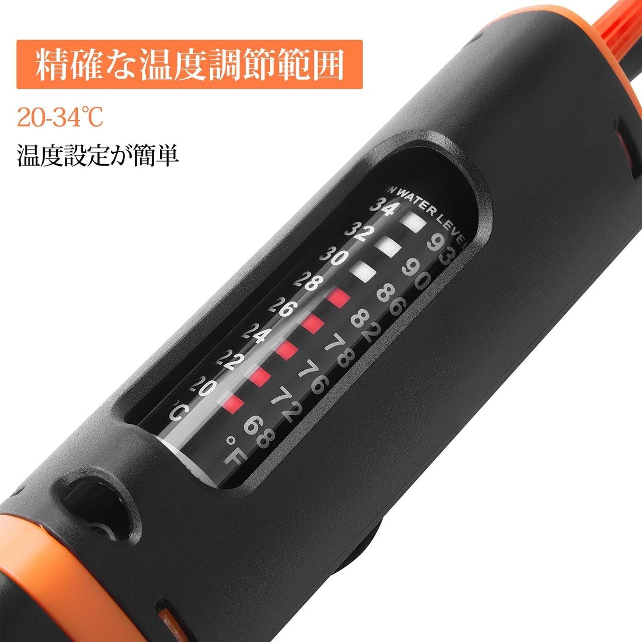 「温度調節可能」:このヒータの温度調整範囲は20℃-34℃、水槽の温度を設定値によくキープすることはできます。