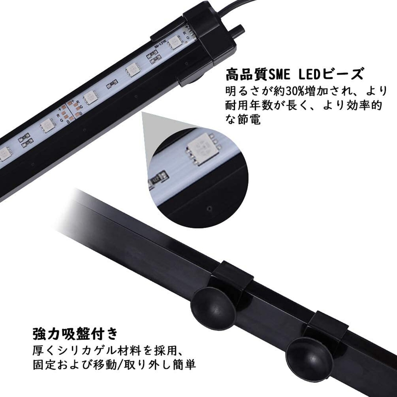 IP68級防水仕様、水に浸かれてでき(電源アダプター・リモコンが防水なし)吸盤式の固定方法は、シリンダー壁上のランプの位置を任意に調整することができます。