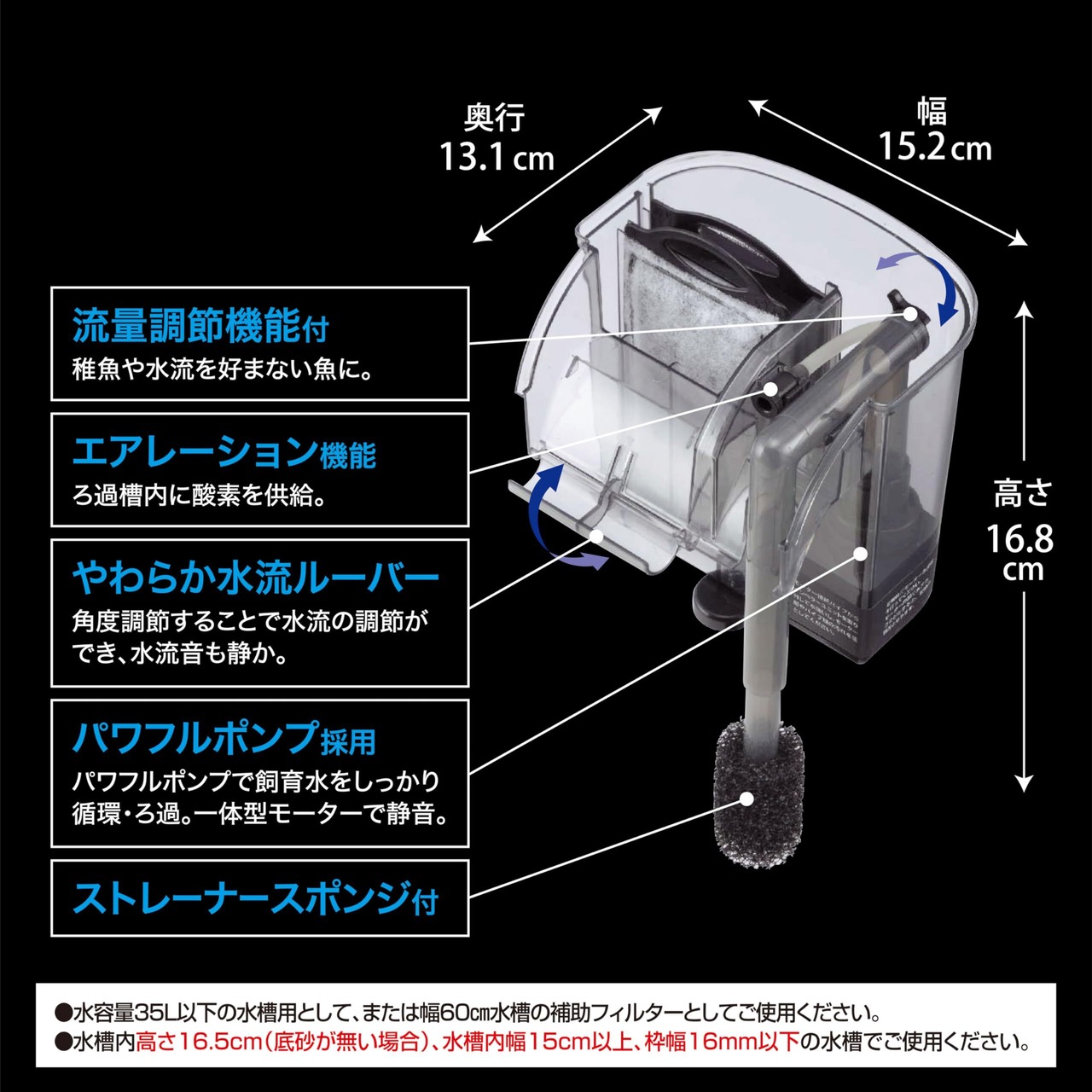 パワフルポンプが水槽のすみずみまで、水をしっかり循環させるからいつも水キレイ! オプションろ過材も追加できる大容量ろ過槽。お手入れもラクラク! 本体一体型、水中ローター方式のモーターなので音が静か! ろ過槽内で、飼育水に酸素を供給できるエアレーション機能付き。 角度調整が可能なルーバー付きで稚魚にも安心、音も静か。 幅30~45cm(水容量35リットル以下)の水槽用外掛けフィルター