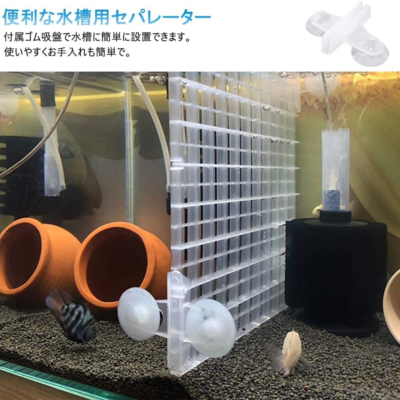 【商品仕様】パッケージ内容:タンクセパレーター×2枚+ゴム吸盤×2個,セパレーターサイズ:30×15cm,格子サイズ:約1×1cm、小さい魚は通り抜ける可能性があるのでご注意ください。