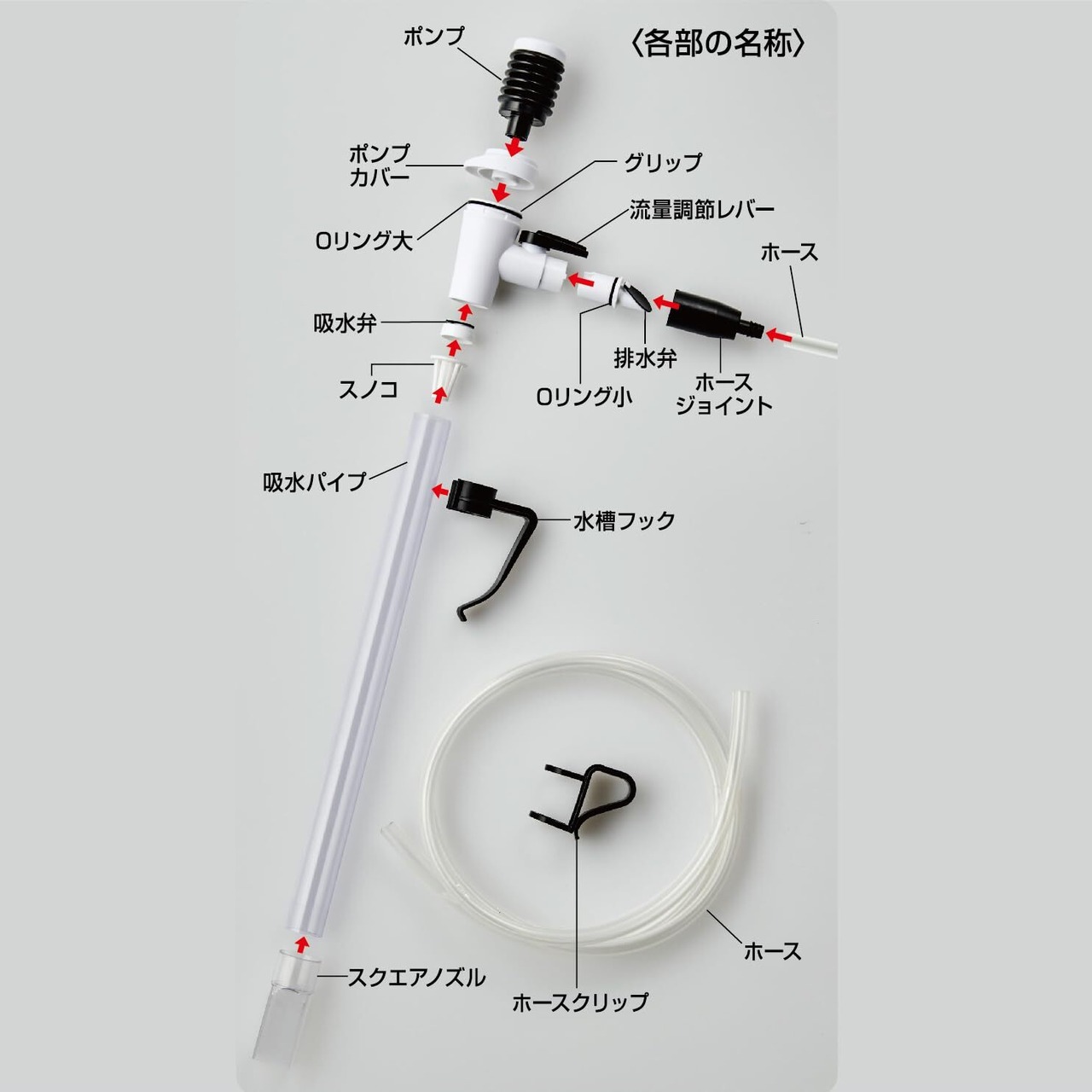 3つのコントロールで普段の水換え&底砂掃除がもっと簡単に! 手元の流量調整レバーで排水量調節。水槽固定フックで排水ライン調節。スクエアノズルで隅や隙間に届く。 ●コントロール自在の水換え&底砂掃除! 【3つのコントロール】1.最小から最大まで繊細なコントロールが片手でできる流量調節レバー。水槽サイズや水容量・底砂の種類に合わせて隅々まで掃除ができる。 2.水槽フックで水槽に固定でき、排水水位を調節できる。 3.スクエアノズルで、水槽コーナー部にもしっかり届く。 ●最大パイプ長 40cm(スクエアノズル装着時) ●2つのシリコン弁で汚れた水の逆流を防ぎます。●細かく分解できるので、メンテナンスしやすい。●排水はポンプを数回押すだけで簡単スタート。●長めのパイプなので、底砂がたっぷり入った水槽でも奥までしっかり差し込んで、底砂の中まで掃除ができます。●排水ホースをバケツに固定するホースクリップ付き。排水中にホースがうっかりバケツから出るのを防ぎます。 <適合水槽>水槽の高さ36cmまで(幅30cm~幅60cm水槽目安) <ホースの長さ>約1.6m <ホース径>外径 約13mm、内径 約9mm <最大パイプ長>40cm(スクエアノズル装着時)