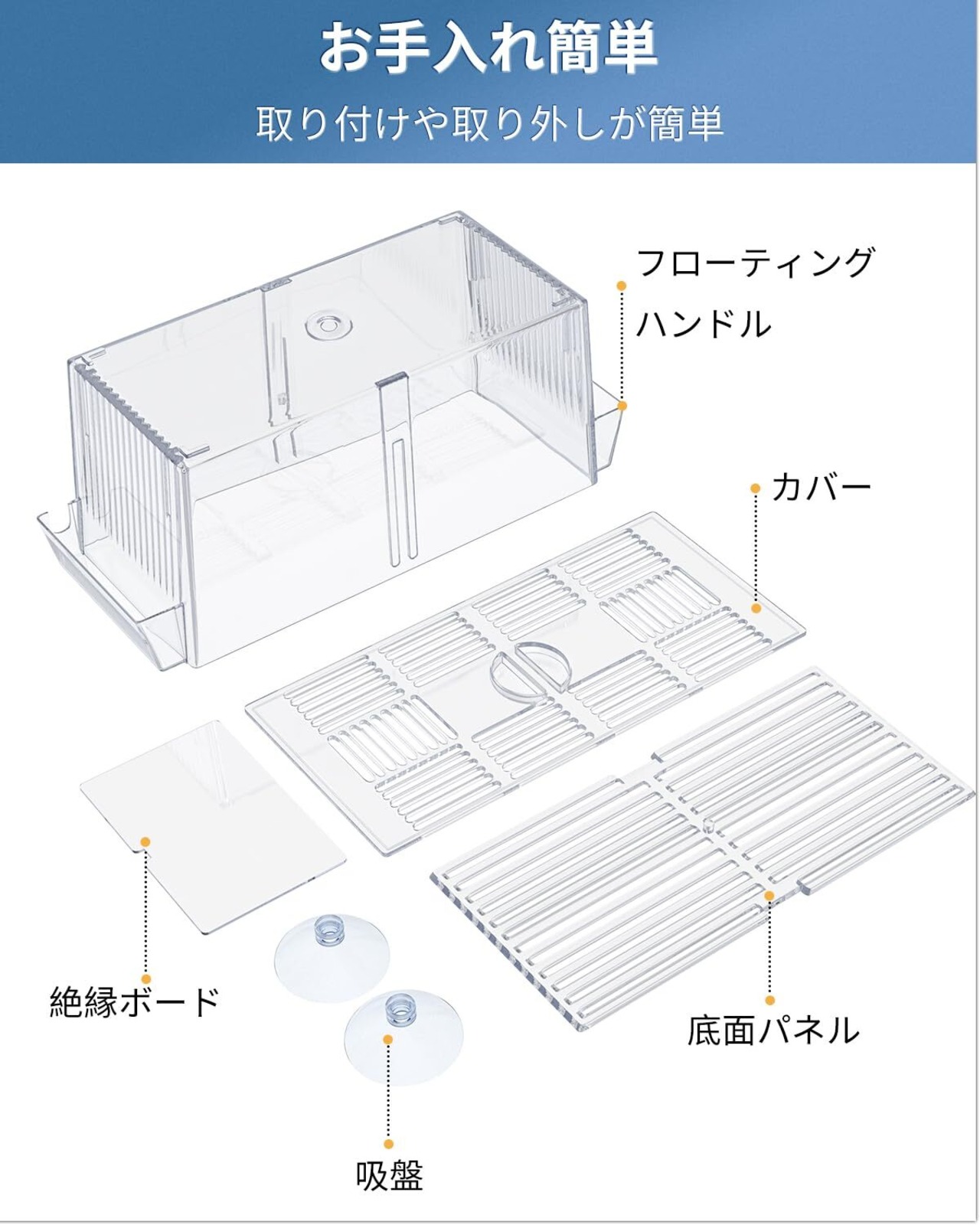 フローティングデザイン: バランスパネルと 2 つのハンドルにより、ボックスを水に浮かせておくことができ、2 つの吸盤でタンク内に固定することもできます。 使用時も省スペース。
