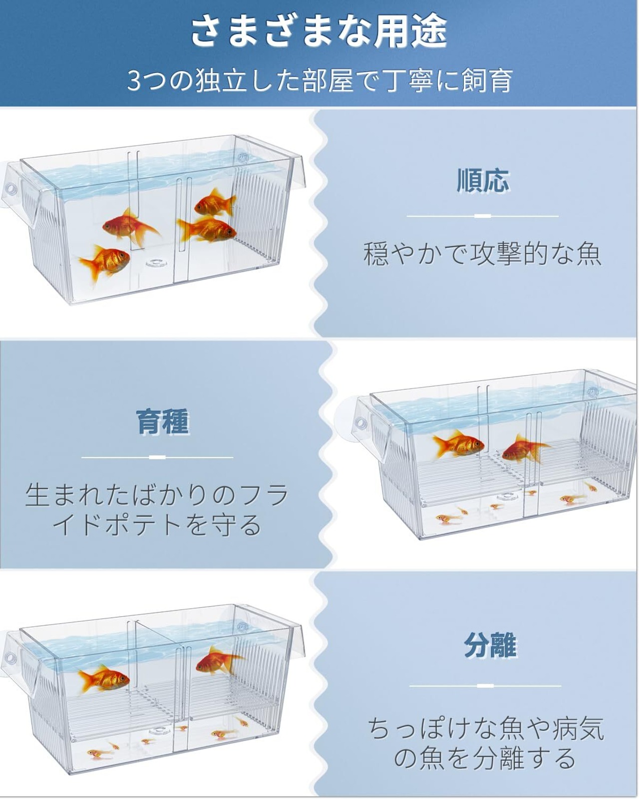 繁殖隔離ボックス: 取り外し可能なセパレーター2枚で3つの部屋を構成します。 一番下は稚魚の孵化場で、別の 2 つの部屋は攻撃的な魚や病気の魚を隔離するために使用できます。