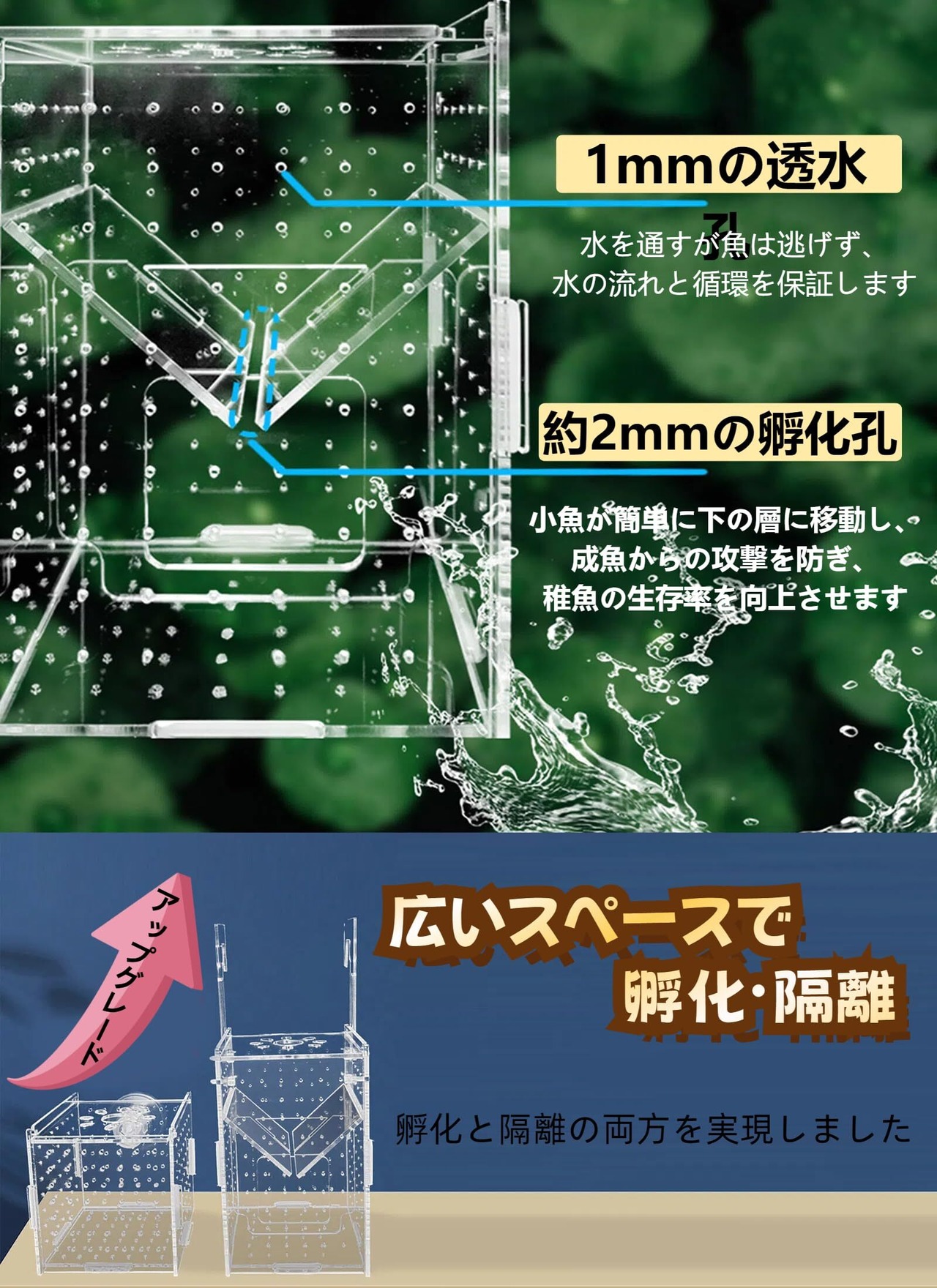 【特別な2in1繁殖隔離ケース】可拆卸の二層隔離デザイン。上層で飼育・繁殖し、その後稚魚が下層に落ちます。1mmの透水孔があり、水を通すが魚は逃げず、水の流れと循環をします 。 真ん中に約2mmの孵化孔が付き、小魚が簡単に下の層に移動し、成魚からの攻撃を防ぎ、稚魚の生存率を向上させます