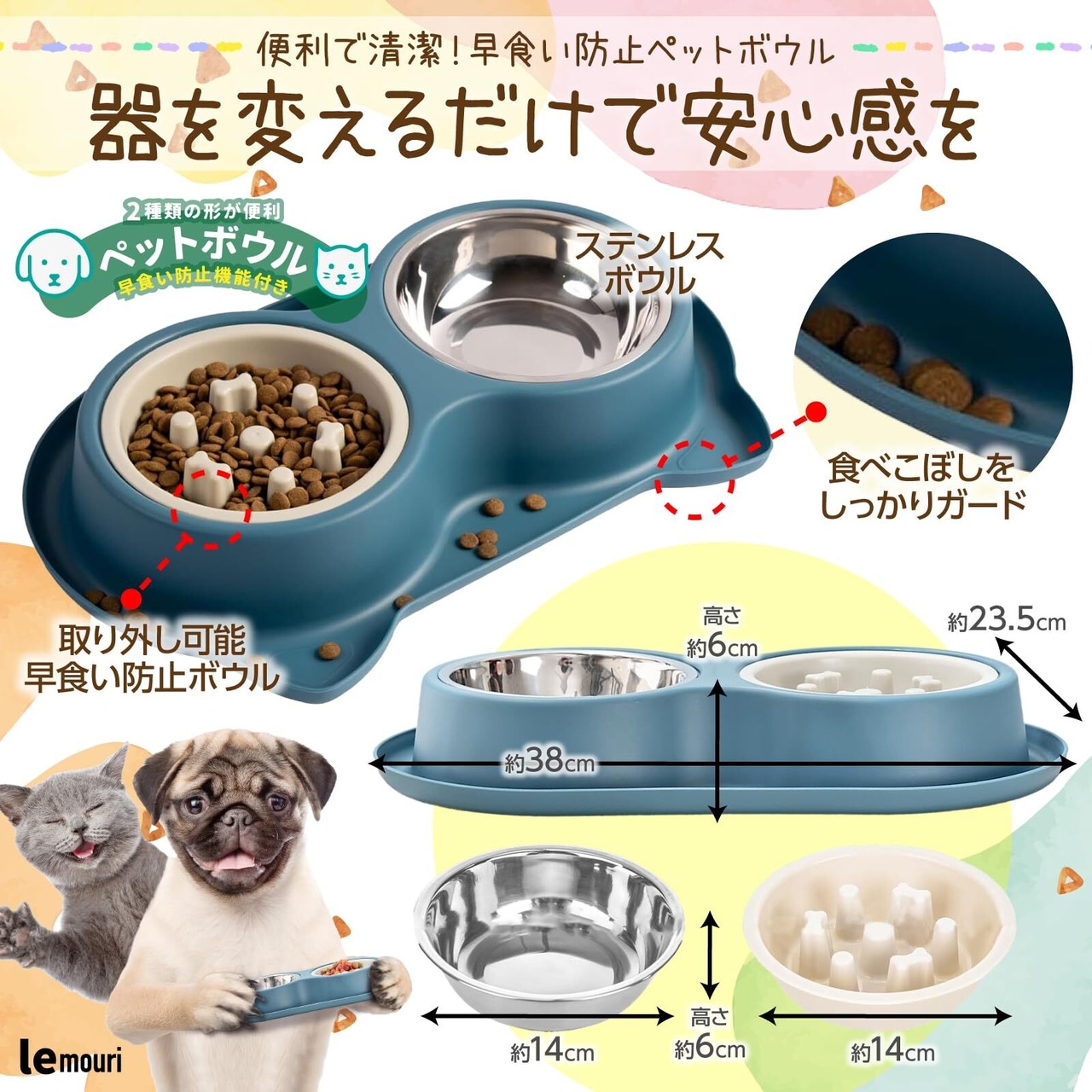 【愛玩動物看護師推奨】lemouri 早食い防止食器 食いこぼし防止 衛生的 滑り止め付き 取り外し式 猫 犬 餌 ペット健康維持 食器洗いOK ご飯台 餌台 (グリーン)