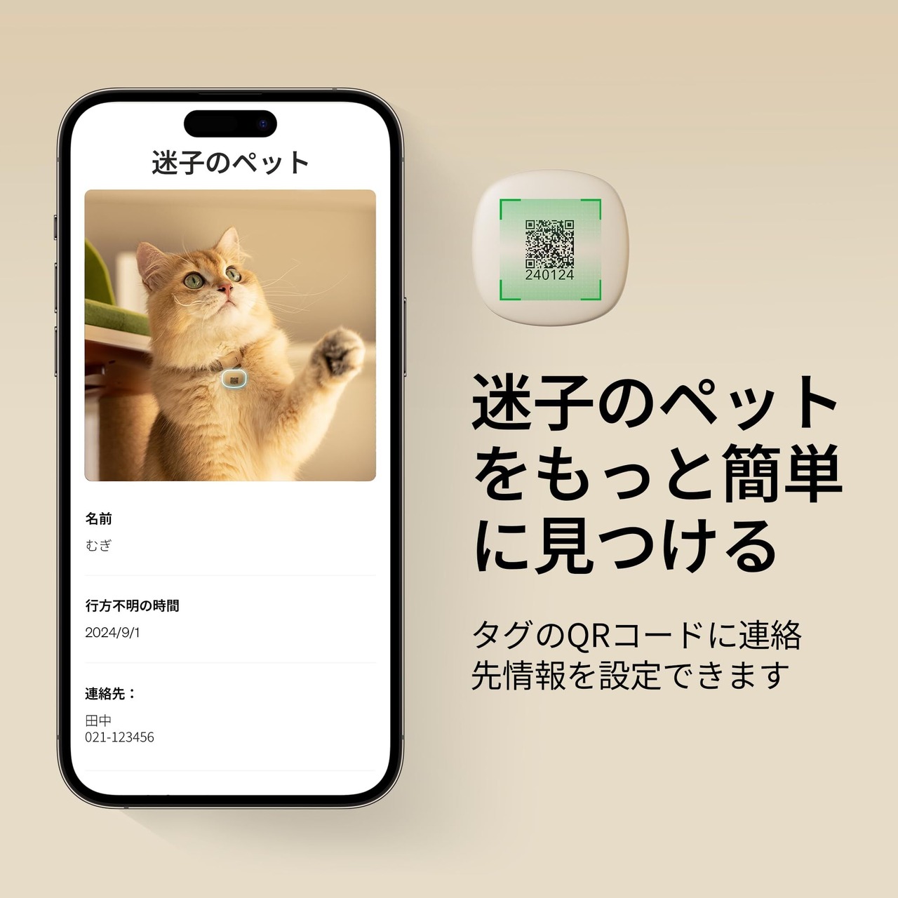 【QRコード】:タグのQRコードを通じて連絡先情報を登録でき、再会がより簡単になります。