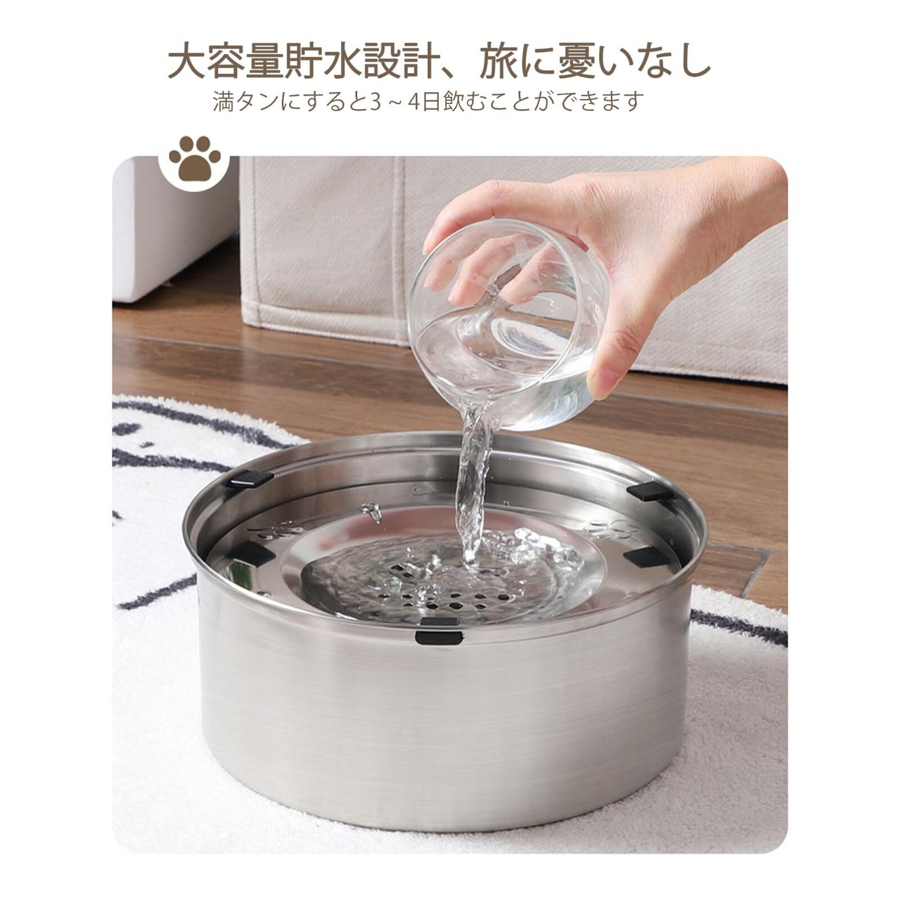 【安全で清潔、新品のように長持ち】本製品は304食品グレードのステンレス鋼で作られ、耐久性があり、サビやカビが発生しにくく、長期間使用しても新品のように清潔に保つことができます。 プラスチック製の給水器と違い、より衛生的で健康的で、細菌の繁殖を完全に排除し、ペットが安心して飲めるように、ペットの健康を守ります。定期的に水洗いできるので、お手入れも簡単です