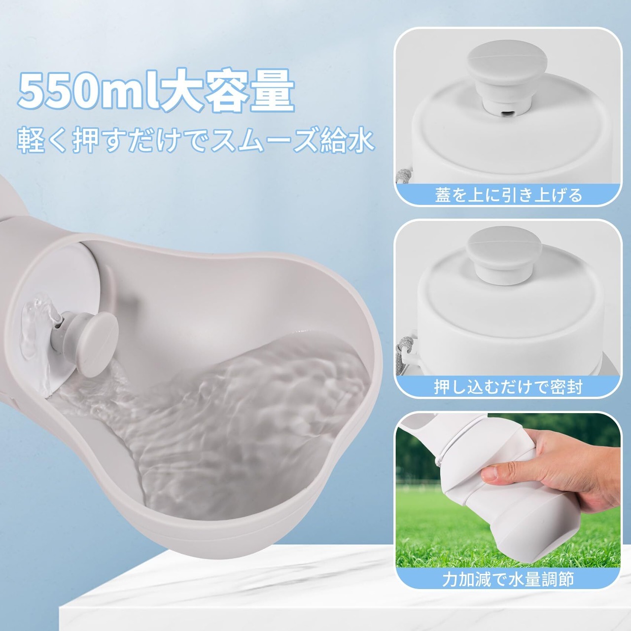 独自のシール設計:犬ペットボトル上部の蓋を上に引き上げ、瓶を傾けた後、本体を押すと水が出ます。押す力の強さで、水の流量を調整できます。キャップを下に押し込むだけで密封され、逆さにしても水漏れゼロ。愛犬が水を飲み終えた後、犬水飲みペットボトルの瓶口を上向きにして本体を押すと、余った水が瓶内に戻り、水の無駄遣いを防げます