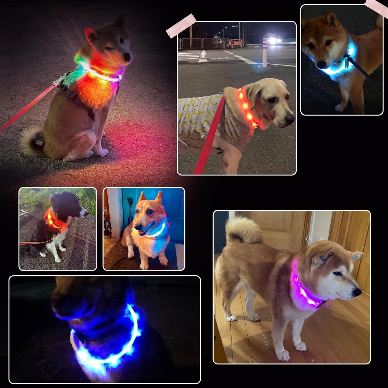 Sazuik 最新型 犬用光る首輪 散歩 ライト usb充電式 装着簡単 柔らかい 軽量 サイズ調整可能 ペット 犬 猫 LED光る首輪 安全対策 視認性 3つの発光モード (レインボー)