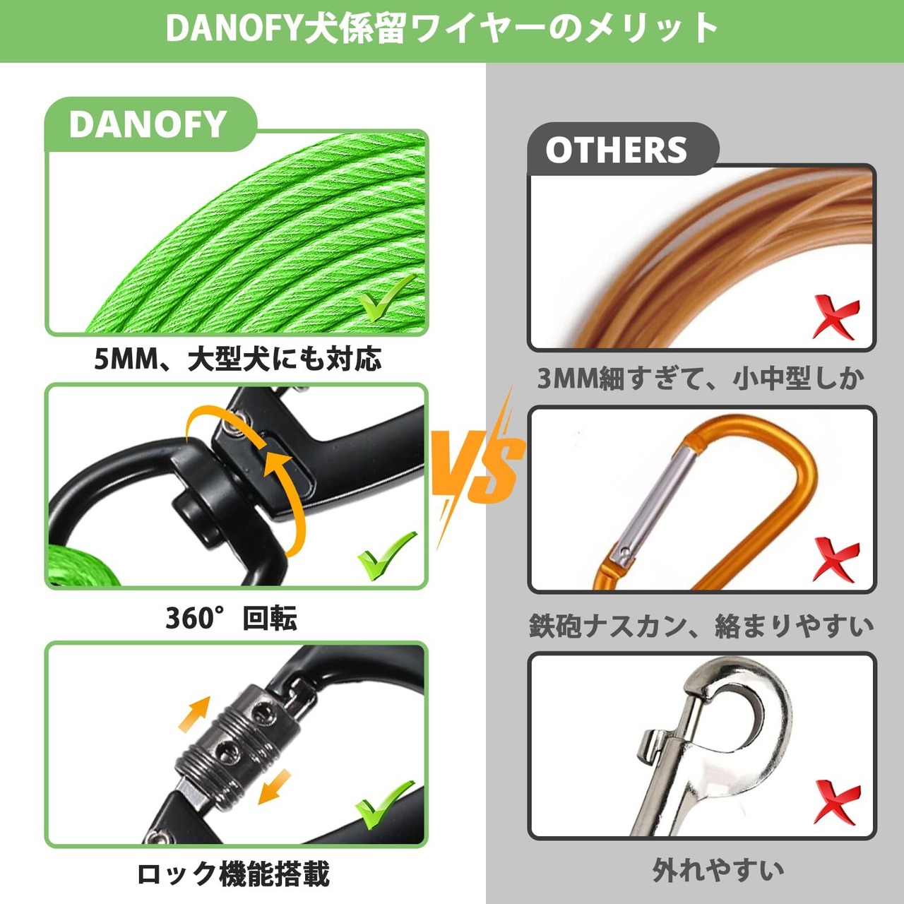 【ロック付きのカラビナ】伝統的なナスカンが使用された犬用 ワイヤーリードと違い、DANOFY係留リードは亜鉛合金製のカラビナを用い、カラビナのレバーにも安全ロック付きなので、ロングリードのハズレからしっかり守ります。また、子犬に対しては、ナスカンが常に重すぎ、亜鉛合金製のカラビナであれば、その悩みを解消します。犬 係留ロープは軽くて高強度であり、耐久性も優れています。ロック付きタイプなので、愛犬が逃れるご心配が不要になります。更に、犬 係留 ワイヤーは360°スムーズに回転できるので、愛犬が思う存分に動き回っても絡まないです。