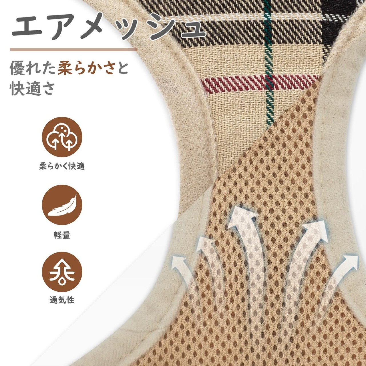 PUPTECK 犬 ハーネス リード セット 犬用 胴輪 はーねす 調節可能 着脱簡単 軽量 メッシュ 通気性 快適 ソフト 反射材付き 引っ張り防止 抜けない 喉に優しい 耐久性 散歩 安全 しつけ用 老犬介護 おしゃれ 小型犬 中型犬 大型犬 (ベージュ チェック, Sサイズ)