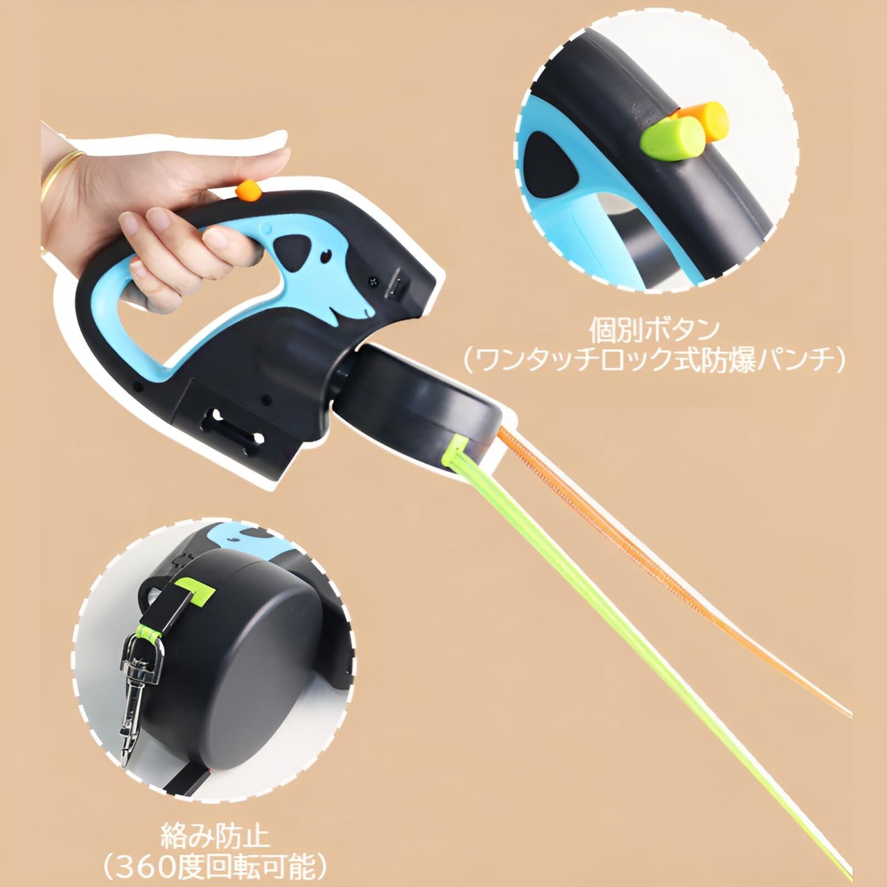 【360°回転・絡まりにくい】ハンドルとリールが360度回転して、2匹のやんちゃな犬が互い違いに交差しても、犬の自由もあり、全く絡まらず、片手で動作も出来、飼主共にストレスフリーです。緑とオレンジのリードを好きな長さでスライドボタンを使って止めることができます。ひもの長さも十分あるのでワンちゃんの自由度が調整できるので犬 ロングリード 3m。