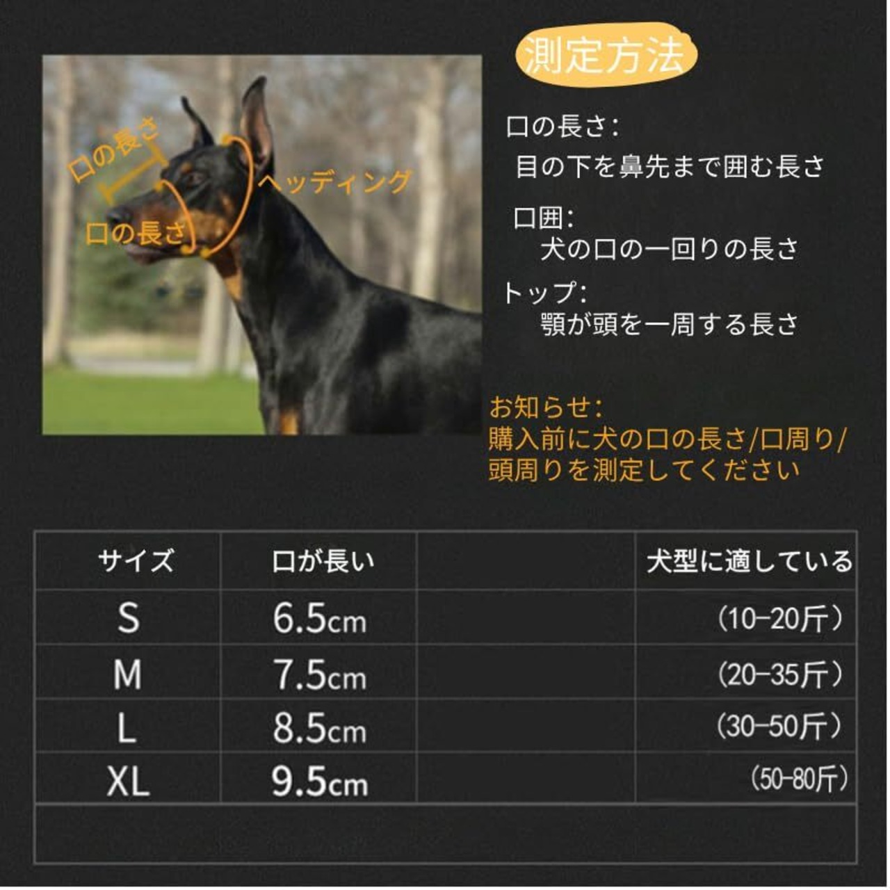 サイズ選択の幅広さ:この犬用口輪には 2 種類のサイズが用意されており、小型犬から大型犬まで幅広い犬種に対応しています。M サイズは長さ 7.5cm で、体重 10 - 17.5KG の犬に適しており、XL サイズは長さ 9.5cm で、体重 25 - 40KG の犬に最適です。ご購入前には、愛犬のサイズを正確に測定して、最適なサイズを選んでください。
