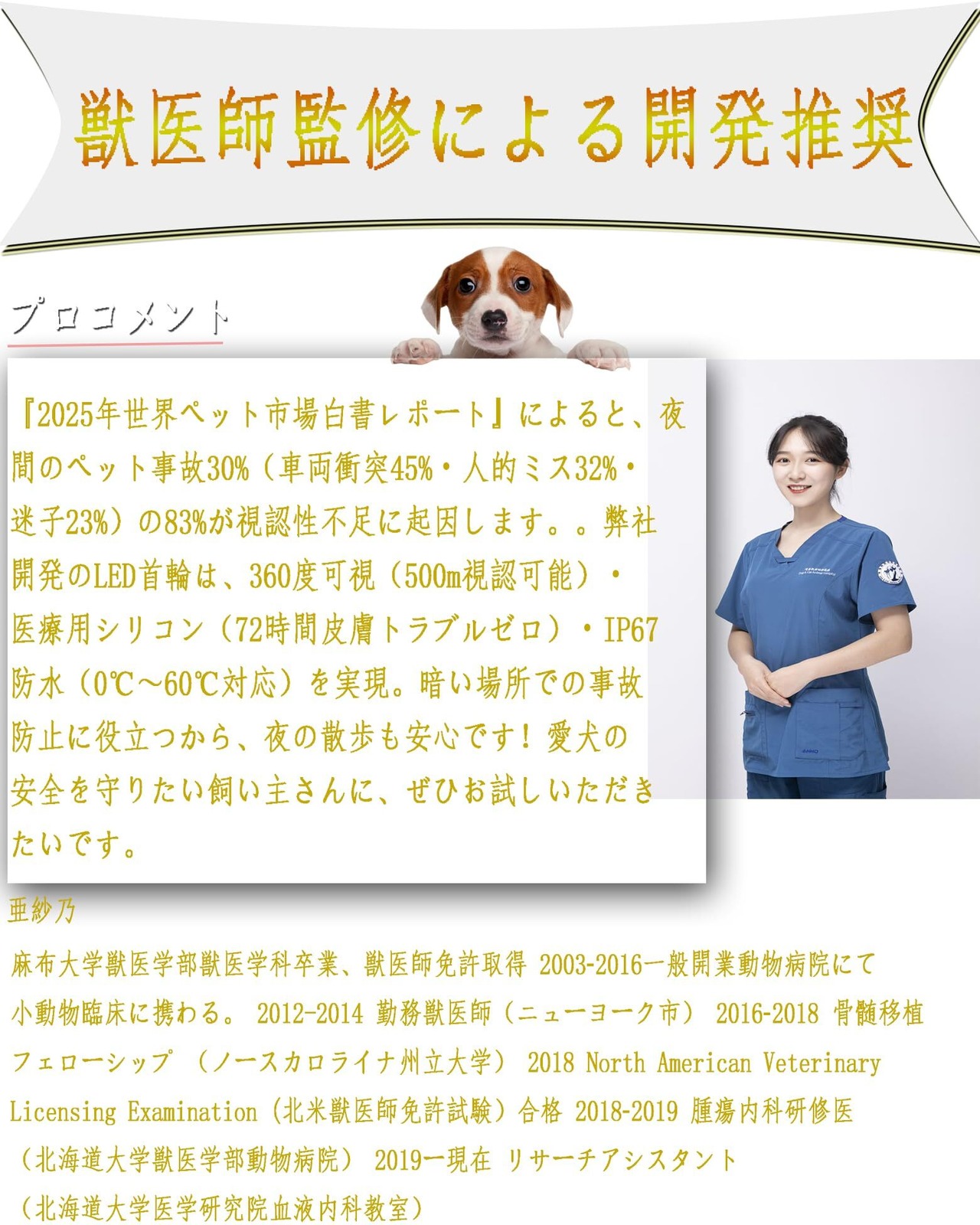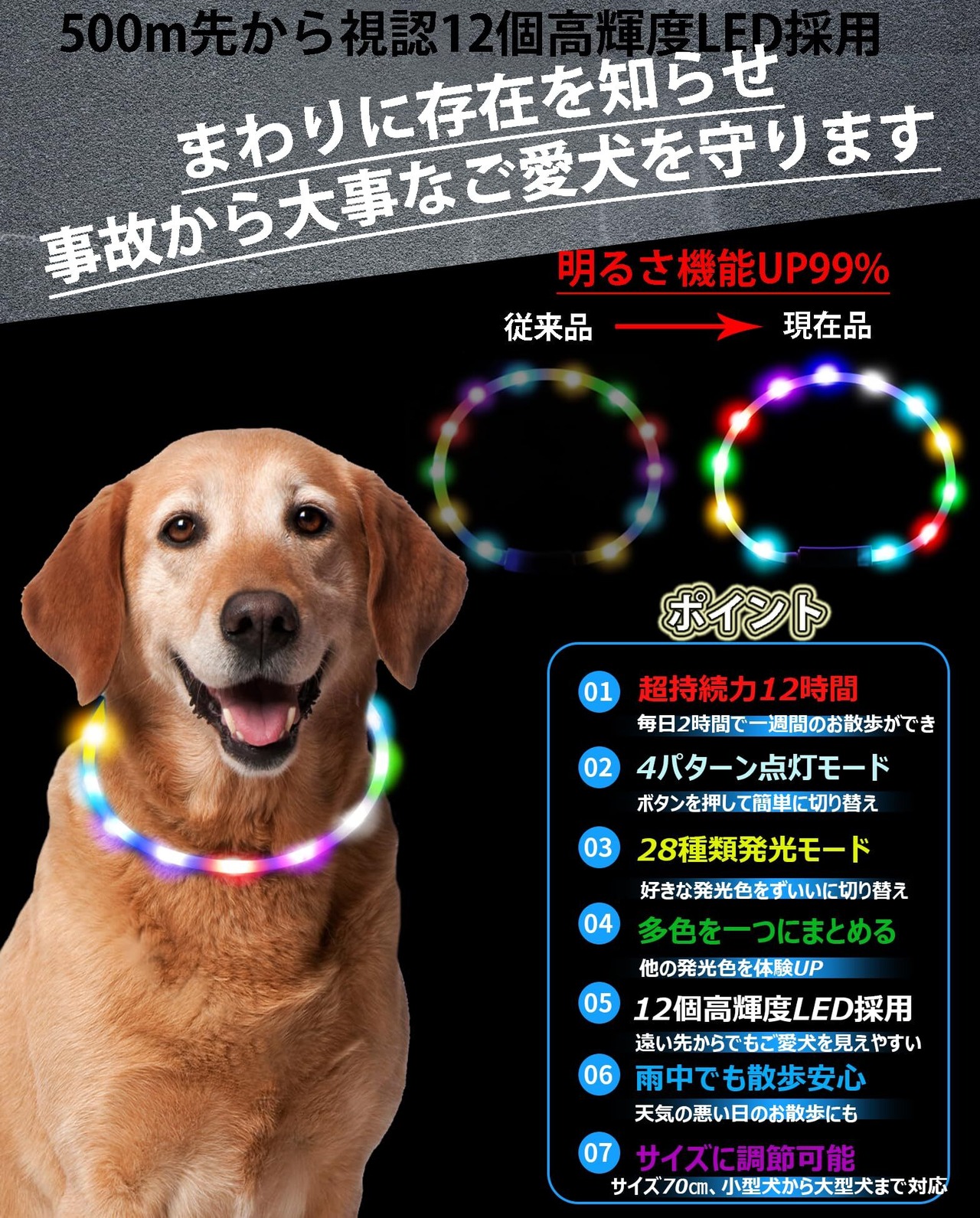 【高い可視性で安心安全】このペット用首輪ライトは12個の独立型LEDチップを採用し、従来品と比べて明るさと発光色が99%向上しています。真暗な夜で非常に明るく、ご主人様と犬の安全性を最大限に向上させます。500m以上先から視認することができ、ワンちゃんの夜間散歩時の事故防止に最適です。安全対策として夜のお散歩に欠かせない犬用LEDライトです。