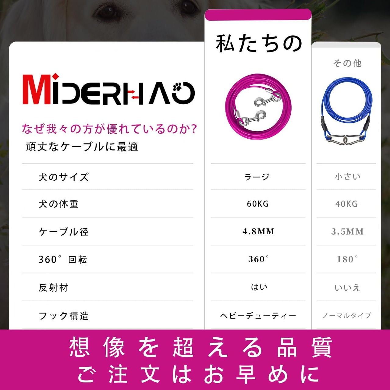 耐久性のある素材を使用しています:スチールケーブルは非常に強く、柔らかいPVC保護チューブに包まれ、耐久性、防錆、高強度抗噛み、犬に引き裂かれることは容易ではなく、より長い期間使用することができますの