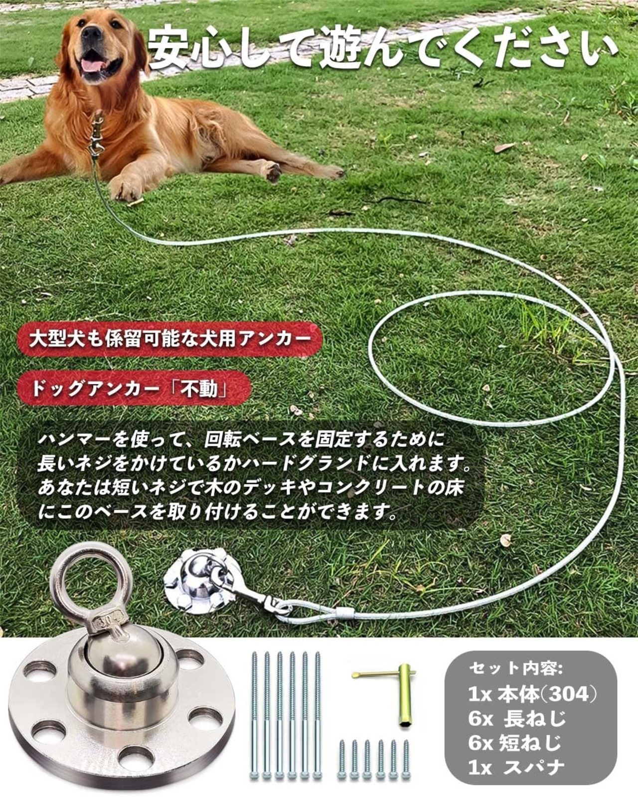 【耐重量性:】110kgの牽引に耐えられるこのアンカーなら、体重35kg程度の犬でも使用OK!(検証による値です。状況によって前後します。)【お知らせ】硬い芝生、硬い三和土、セメント畑で使うことができる。砂地・湿地帯での使用はお勧めできません。