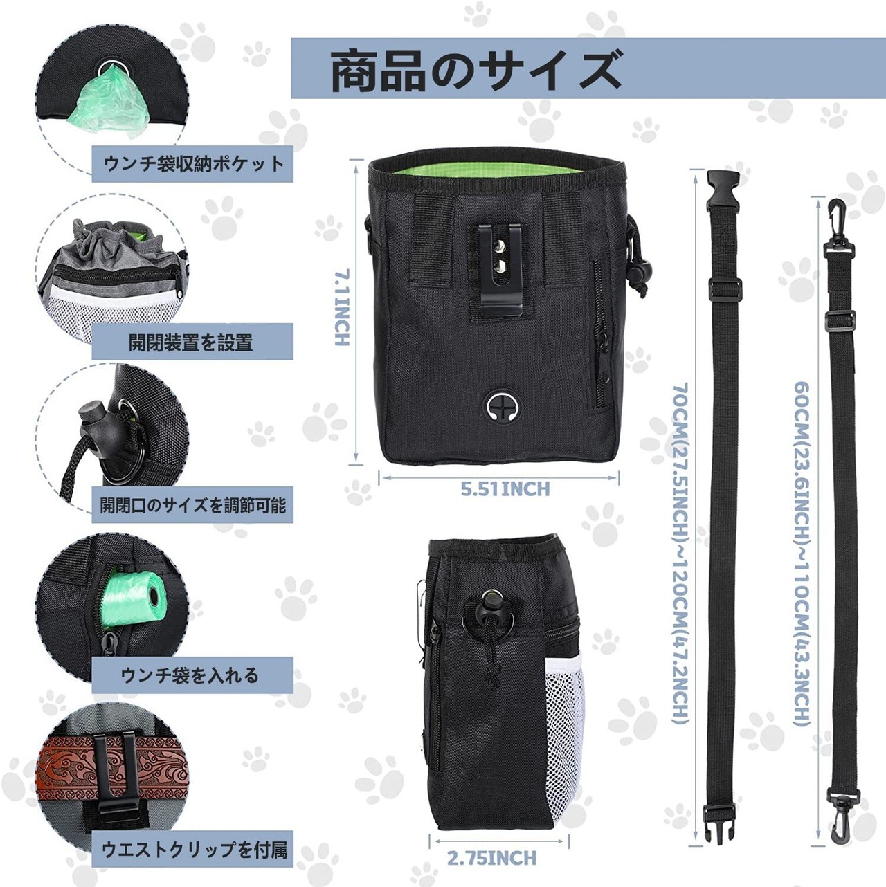 【製品のサイズ】トリーツポーチのサイズ:18cm*14cm*6cm。重量:約143g。ショルダーベルトの周りサイズ:約36cm-55cm(調節可能)。ウエストベルトの周りサイズ:33.5cm-53cm(調節可能)。セット内容:トリーツポーチX1、ショルダーベルトX1、ウエストベルトX1。
