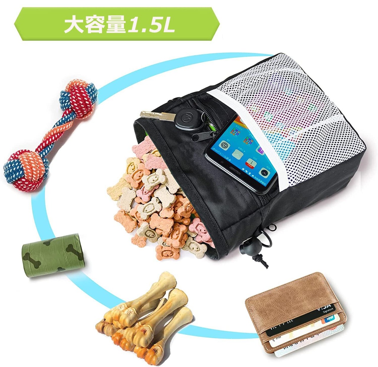 【大容量トリーツポーチ】トリーツポーチのメインポケットの最大容量は約1.5L、普段は犬のおやつとか犬の散歩グッズ とか全部収納可能です。ウンチ袋収納ポケットと携帯、鍵等の小物収納ポケットも付きますので、犬とお出かけ用品が全て入れます。