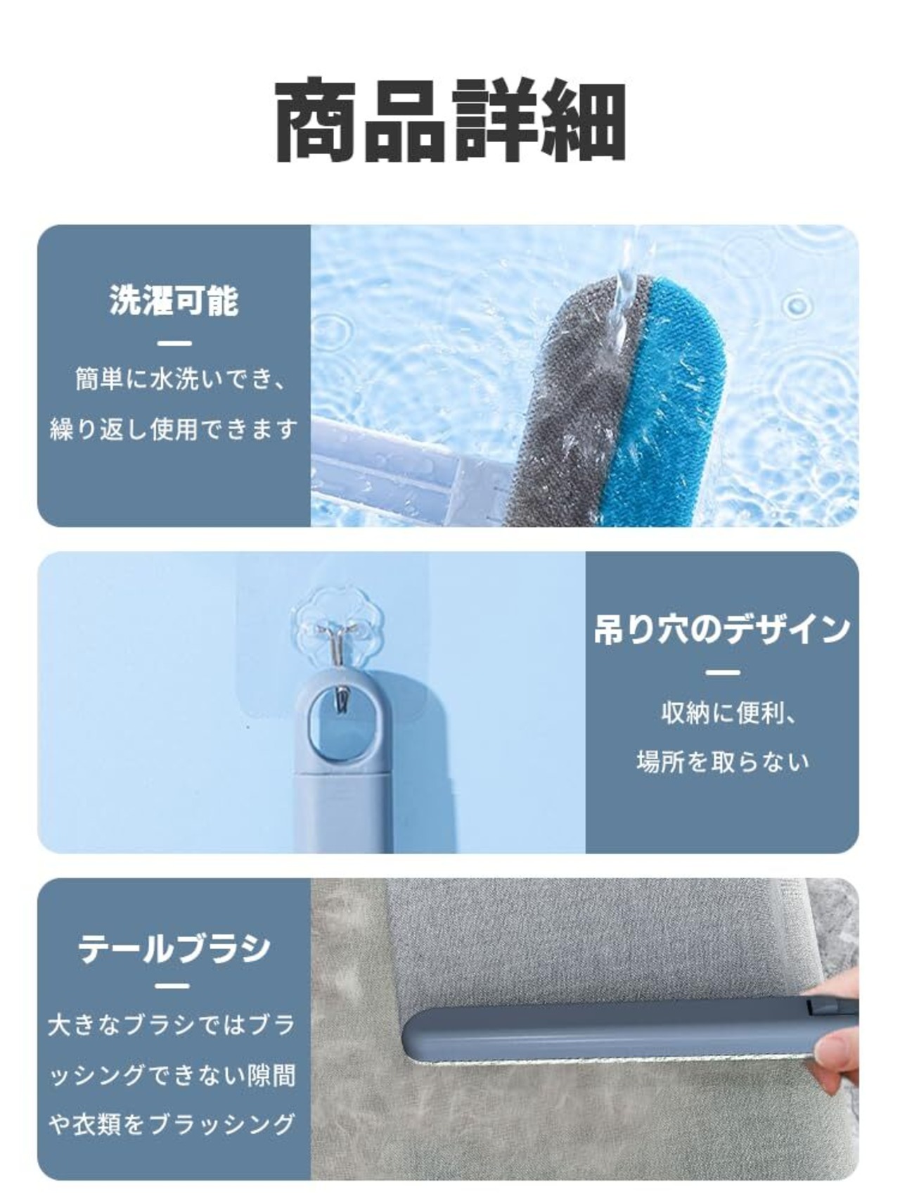 【4-IN-1 ペット 毛取りブラシ】ペット用抜け毛クリーナー、柔らかくて細い毛を備えた4-in-1のデザインで、幅広の18CMの大きなブラシヘッドは、一度拭くだけでソファやベッドの毛を素早く掃除できます。尾には長い小さなブラシが付いており、衣服などの小さな領域の毛を取り除くのに使用できます。背面のスクレーパーはガラスやフロアを掃除でき、濡れた状態でも使用できます。尾には長い小さなブラシが付いており、衣服などの小さな領域の毛を取り除くのに使用できます。ヘッドには隙間や死角をより効果的に掃除できる小さなブラシが付いています。