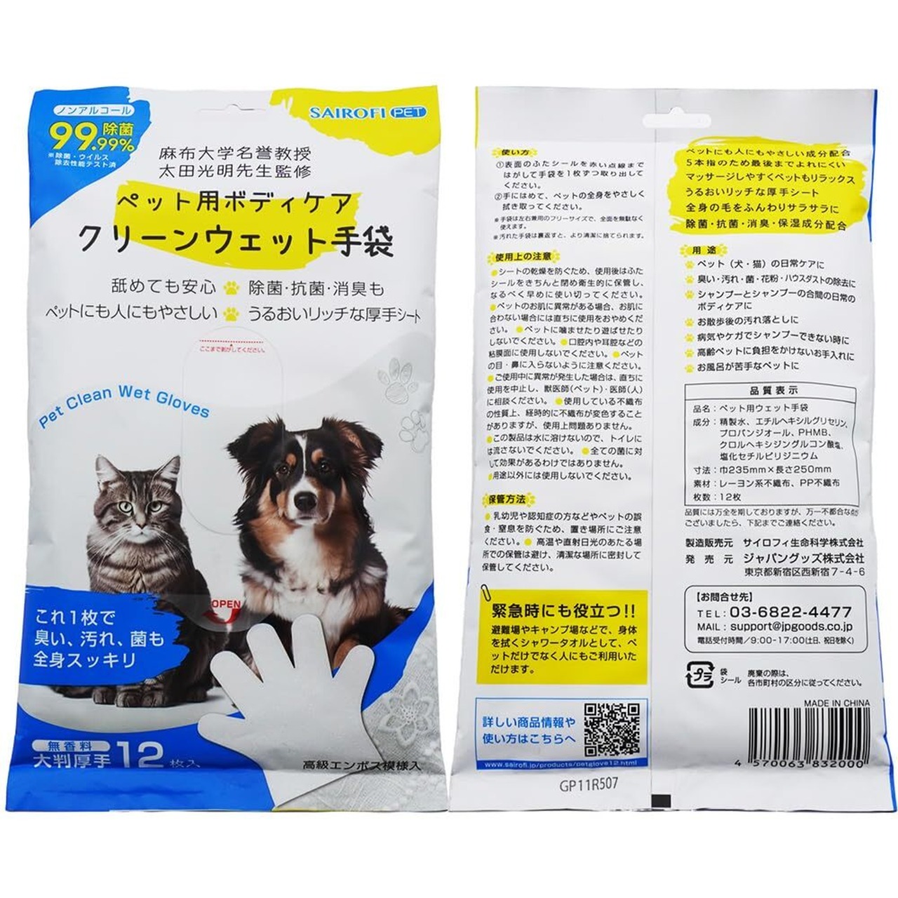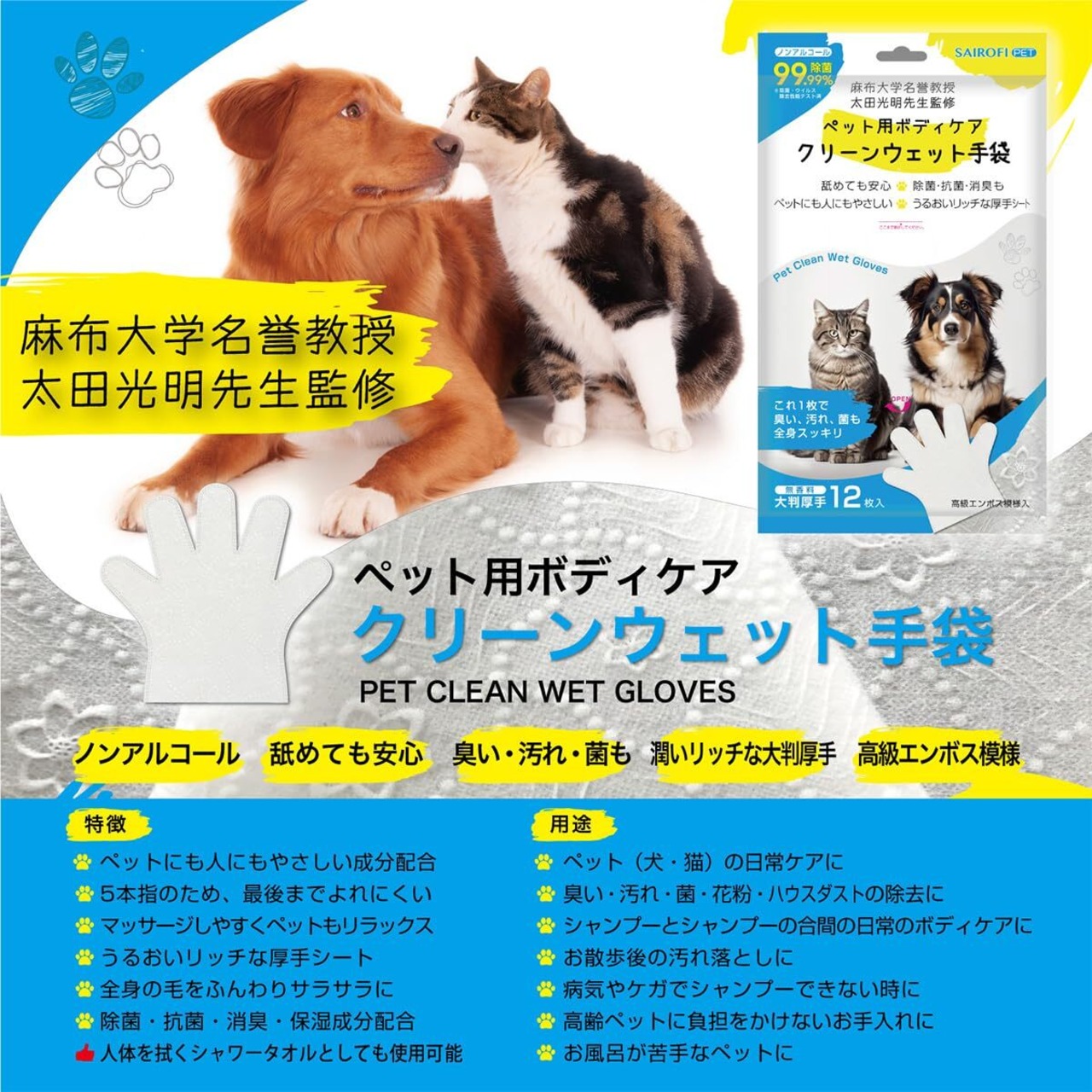 【12枚】ペット用ボディケア クリーンウェット手袋 犬猫共用 シャンプータオル ウェットシート 大判 潤い 厚手 無香料 舐めても安心 除菌 消臭 [麻布大学名誉教授 獣医師監修]