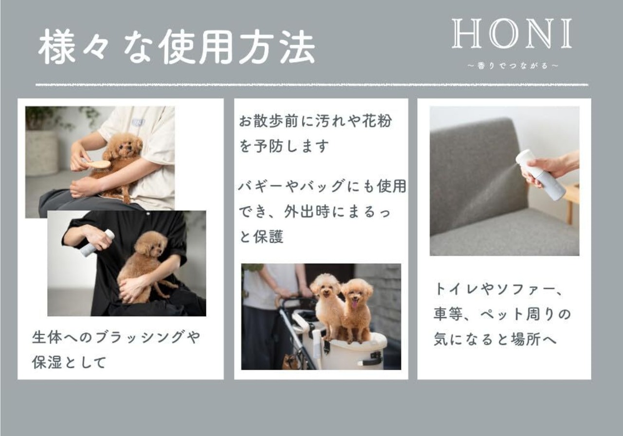 ・お散歩や外出前に生体だけでなく、バギーやバッグにも使用することで埃や花粉をつきにくくします。