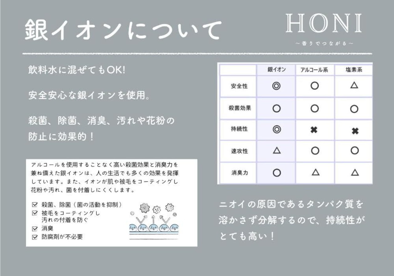 水、ホウケイ酸(Ca/Na)、酸化銀、シイタケエキス、ドクダミエキス、BG,PEG-60水添ヒマシ油、香料