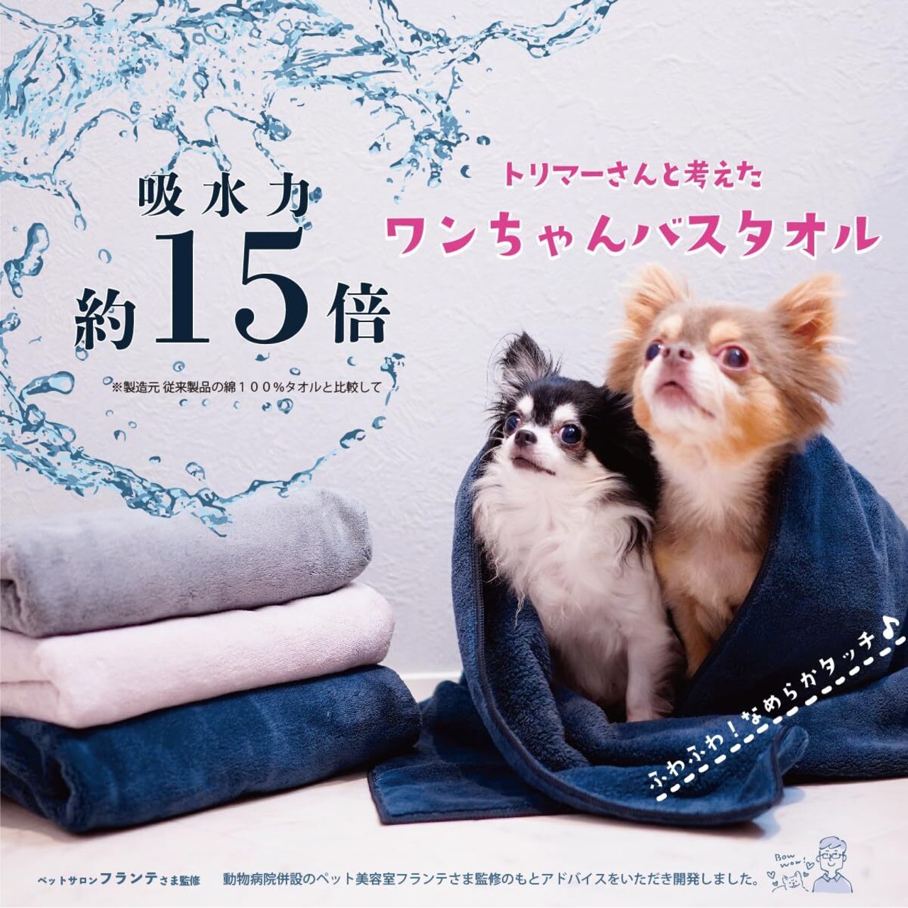 ●綿のタオルと比べて、約15倍の吸水速度!ふわふわマイクロファイバー生地のペット用バスタオルです。 ●なめらか生地なので毛を引っ張りにくく、敏感なワンちゃんも逃げずに拭かせてくれそうです。 ●シャンプー後の拭き取りがあっという間に終わるので、シャンプーやドライヤーが苦手なワンちゃんに最適です。 ●しっかり吸水してくれるので、ドライヤーをする時間が短縮できて、飼い主さんもワンちゃんもストレス軽減! ●雨の日のお散歩で汚れを洗うとき、水遊び後の水拭き時、冬場の乾きにくい日にあると助かります。 ●トイプードルのようにわしゃわしゃ毛の子やゴールデンレトリバーのように長毛の子など、オールマイティに使えます。 ●よく水を吸うので手に届くところに置いておけば、おしっこを漏らしたときなどの緊急時にも活躍します。 ●吸水性がいいタオルは、多頭飼いの方にもおすすめ!今まで使っていたタオルの枚数がグッと減ります。 ●綿のタオルを使用していたときより洗濯物を減らせて、洗濯後も乾きやすいので次の日も安心です。 ●タオル以外にもブランケットとして使ってみるのも!寒い冬もペットを温かく包み込んでくれます。 ●ご家庭だけでなく、動物病院やペットサロンでのシャンプー後の拭き取り用タオルに使用するのもぴったりです。 ●ご自身やご家族用にはもちろんですが、ワンちゃんを飼い始めた方へのプレゼントにも喜ばれそうです。 ※本品はペット用タオルです。本来の用途以外では使用しないで下さい。