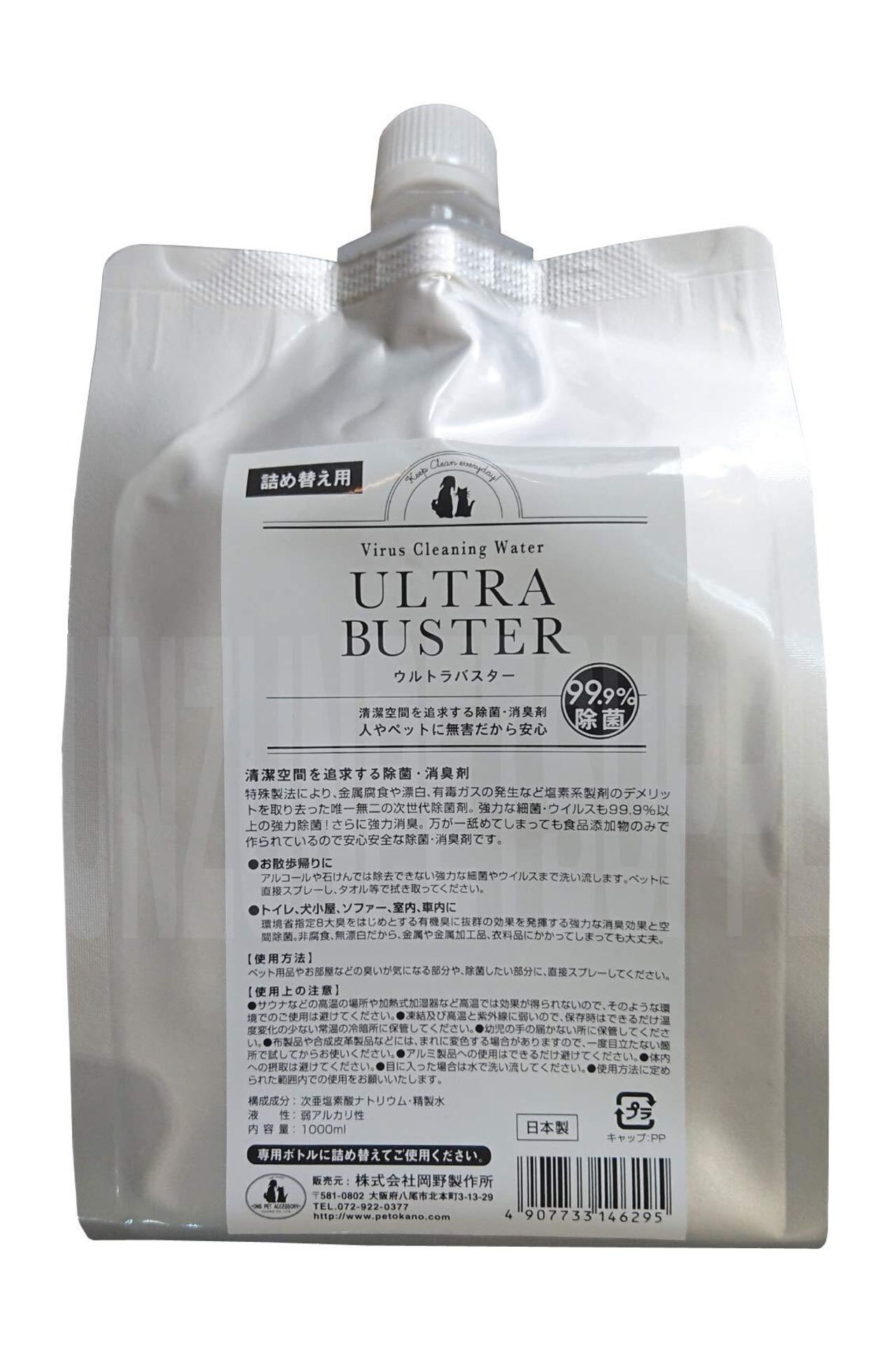 ウルトラバスターの詰め替え用です。 特殊製法により、金属腐食や漂白、有毒ガスの発生など塩素系製剤のデメリットを取り去った唯一無二の次世代除菌剤。協力な細菌・ウイルスも99.9%以上の強力除菌!さらに強力消臭。万が一舐めてしまっても食品添加物のみで作られているので安心安全な除菌・消臭剤です。