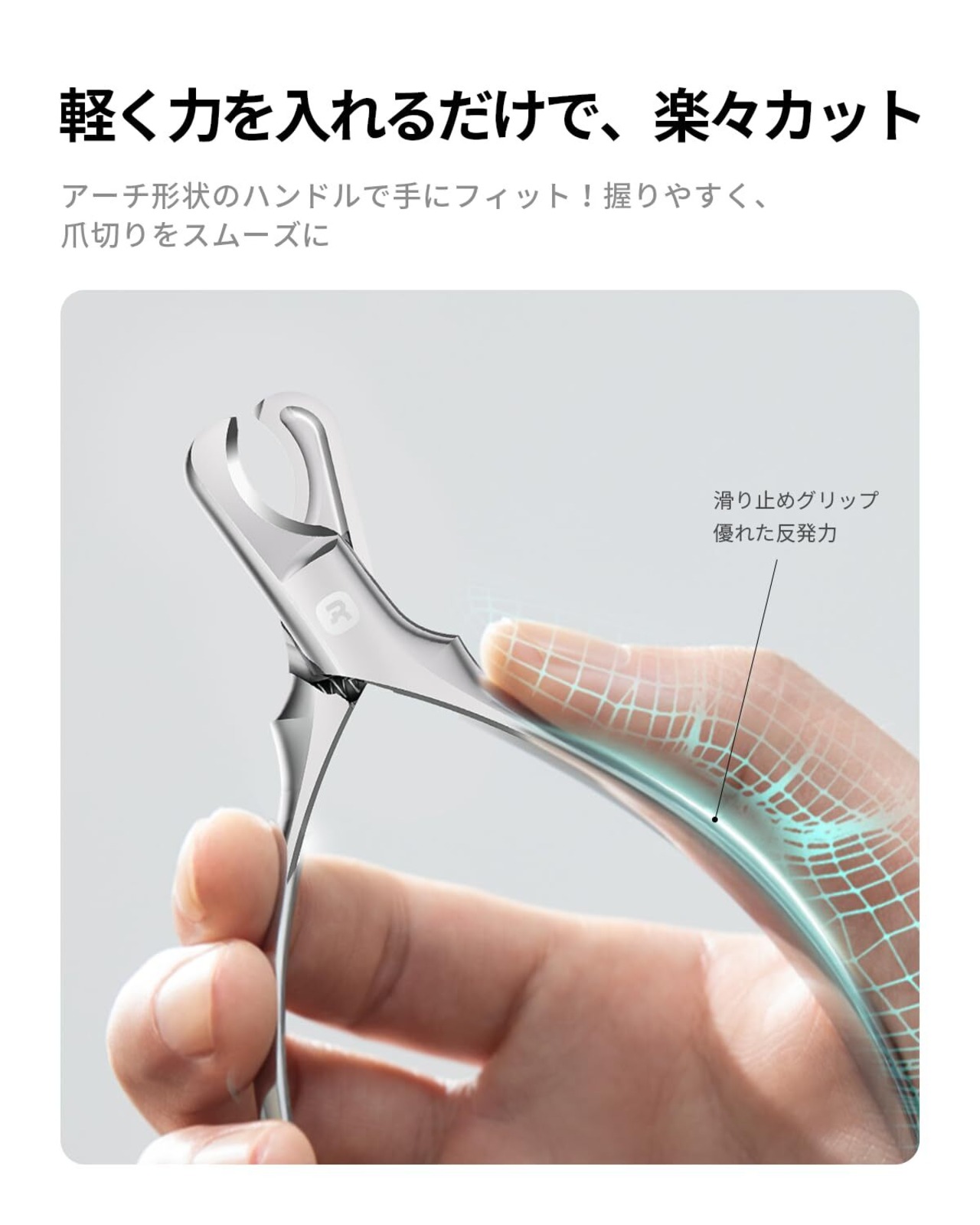 初心者もラクラク! 握りやすさ&軽い力でカット:人間工学に基づいたアーチ型のハンドルで、軽い力でスムーズに切れます。優秀な反発力に加え、爪切りがさらに楽になります。滑りにくいハンドルと指フィットの窪みで、握りもやすくなります。初めてでも安心してお使いいただけます。
