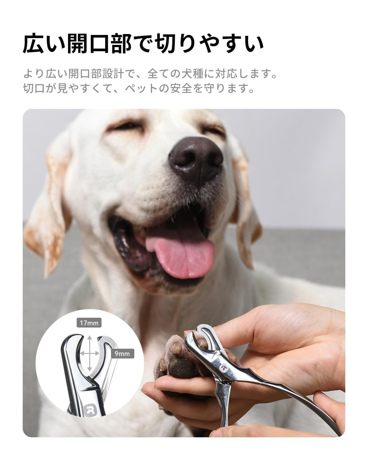 あらゆる犬種に対応、大型犬も安心:開口部がより広い&長い設計であり、爪がちょっと太い子でも使えます。切り口がしっかり見えるので、切りすぎや爪の中の血管を傷つけるリスクを大幅に軽減します。