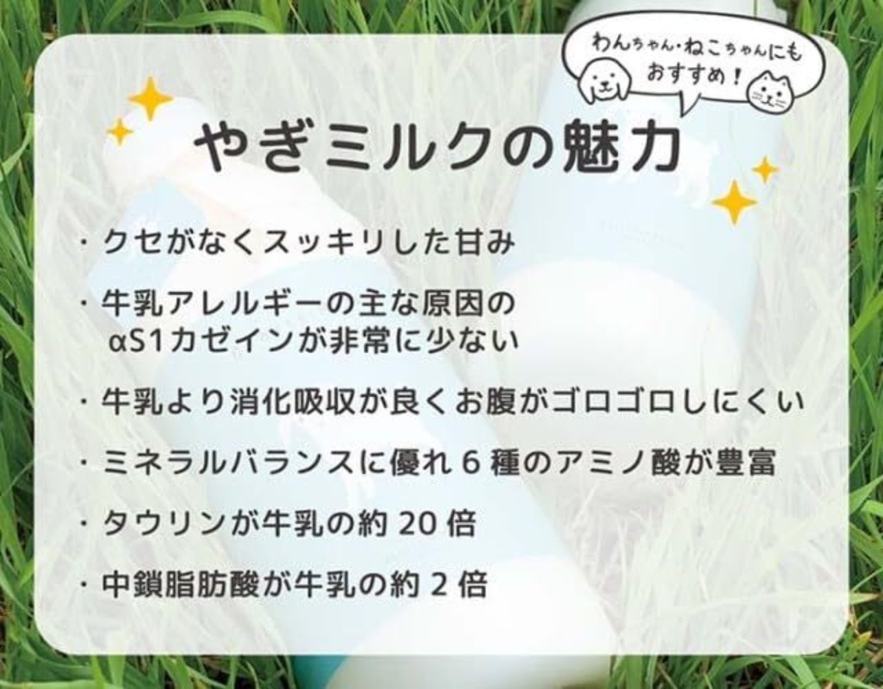 ・北海道日高町にある、全国でも最大規模の自社牧場で生産 ・機能性抜群 ・ヤギ舎を清潔に保ち、山羊にストレスを与えない環境を作ることで、くさみがほとんど感じられない、美味しいやぎミルクとなっている ・身体の健康に欠かせない6種のアミノ酸が牛乳よりも豊富 ・血圧やコレステロール値をコントロール。タウリンは牛乳の約20倍 ・牛乳アレルギーの主な原因となるαS1ガゼインが非常に少ない ・牛乳よりも脂肪球が小さく、消化吸収が良いので腹痛を起こしにくい ・ダイエット効果が期待できる、中鎖脂肪酸が牛乳の2倍 ・犬や猫の健康維持に役立つ