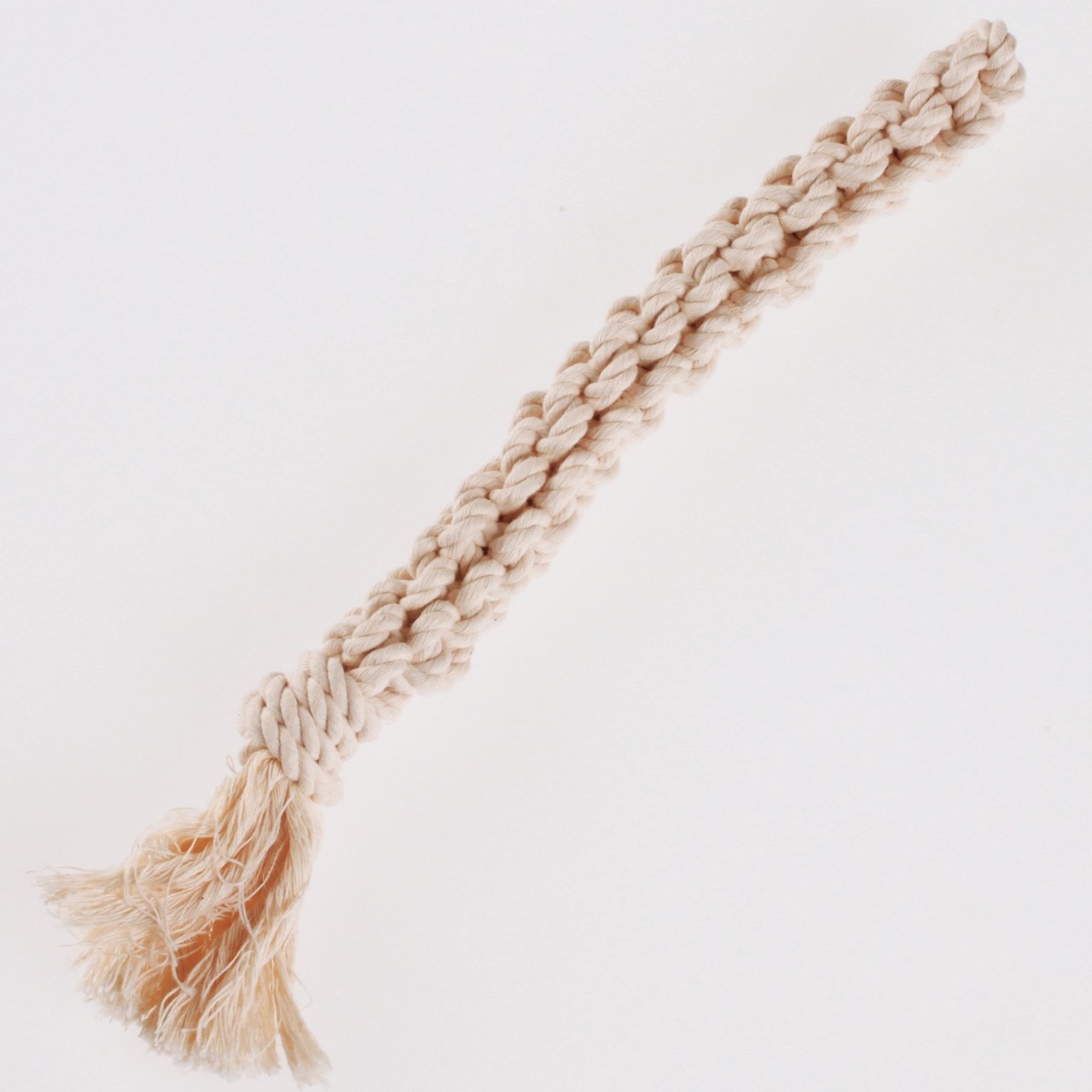 しっかり噛める、コットン100%。くわえやすい、スティック型のおもちゃ。ットン糸を編みこんだおもちゃ。糸をぎゅっと縒ったコットンロープ玩具とちがい、編み目に歯が根元までよく食い込みます。噛むことで歯の汚れが落ち、歯ぐきも鍛えられます。<対象:小型犬>