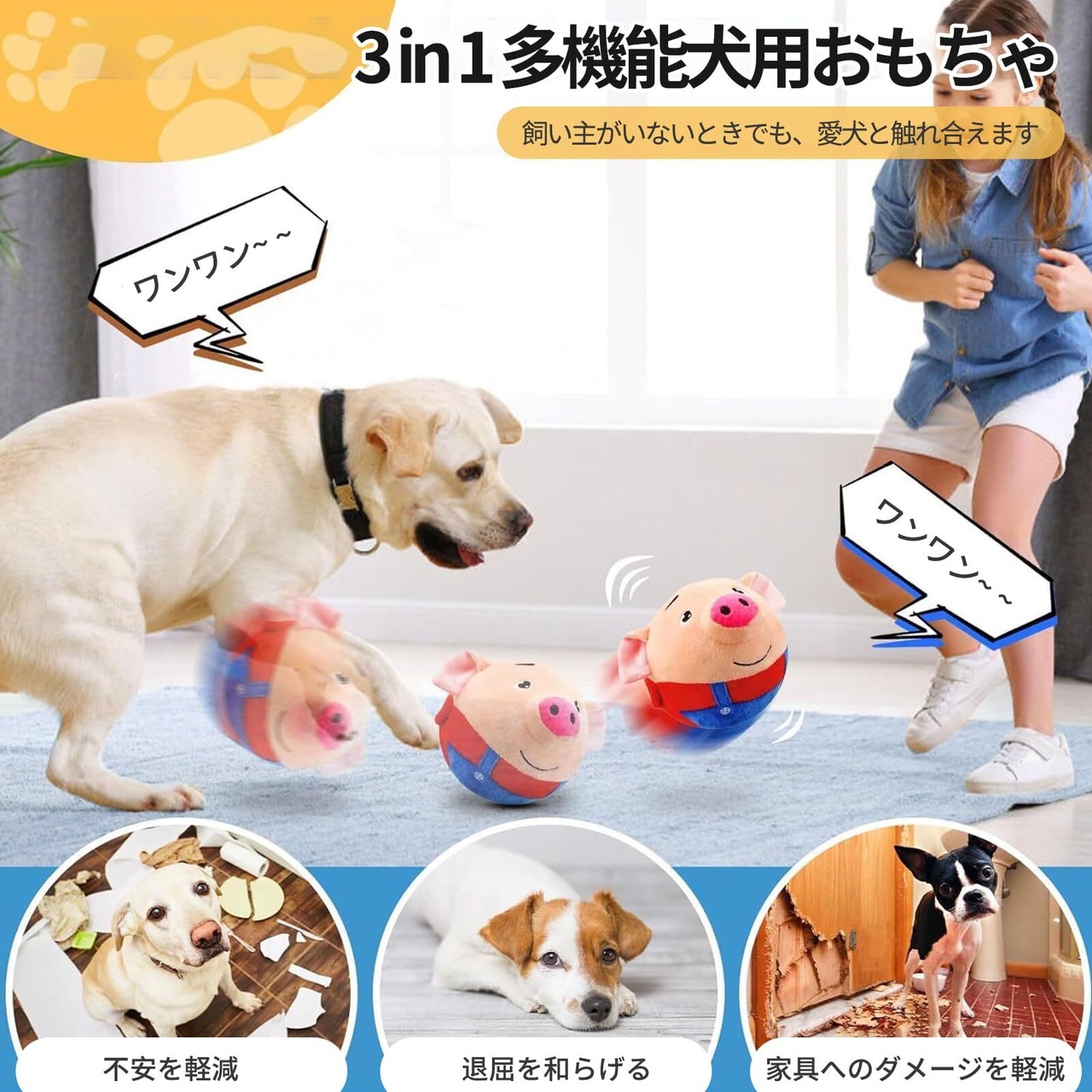 【多機能設計】このインタラクティブなぬいぐるみは、愛犬が思う存分体を動かして遊ぶことができます。多機能設計で、犬を楽しませたり、しつけをしたり、一緒に遊んだりすることができます。飼い主がいないときは、ボールを愛犬に寄り添わせ、運動や遊びを助けます。