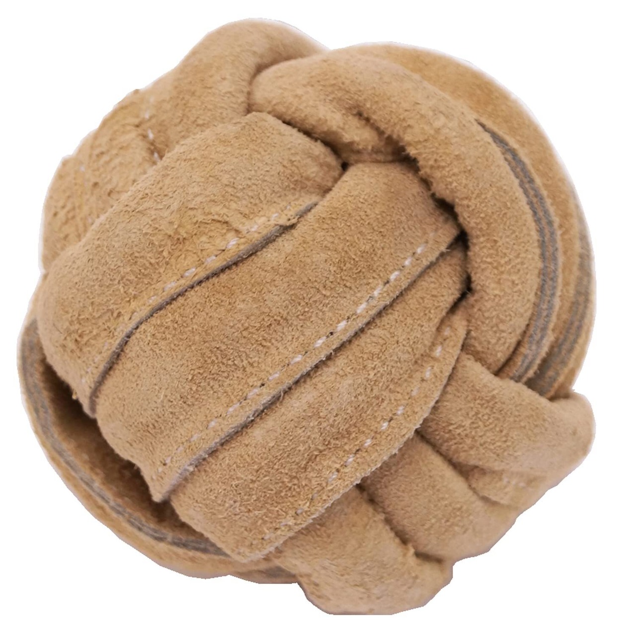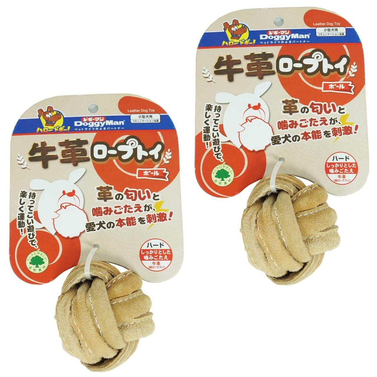 ・コットンの心材を牛革で包み込んで作ったロープを編んで結んで作った小型犬用おもちゃ。・牛革特有の香りと歯ごたえは獲物そのもの。天然素材による独特の弾力と噛み心地が犬の本能を刺激する。・牛革の香りに誘われてガシガシ噛んでも壊れにくい丈夫なおもちゃ。・噛みごたえがあるハードタイプ。ガシガシかじってデンタルケア玩具としても使える。・投げて持ってこさせたり、転がして遊べる人気のボール型。直径約8cm。