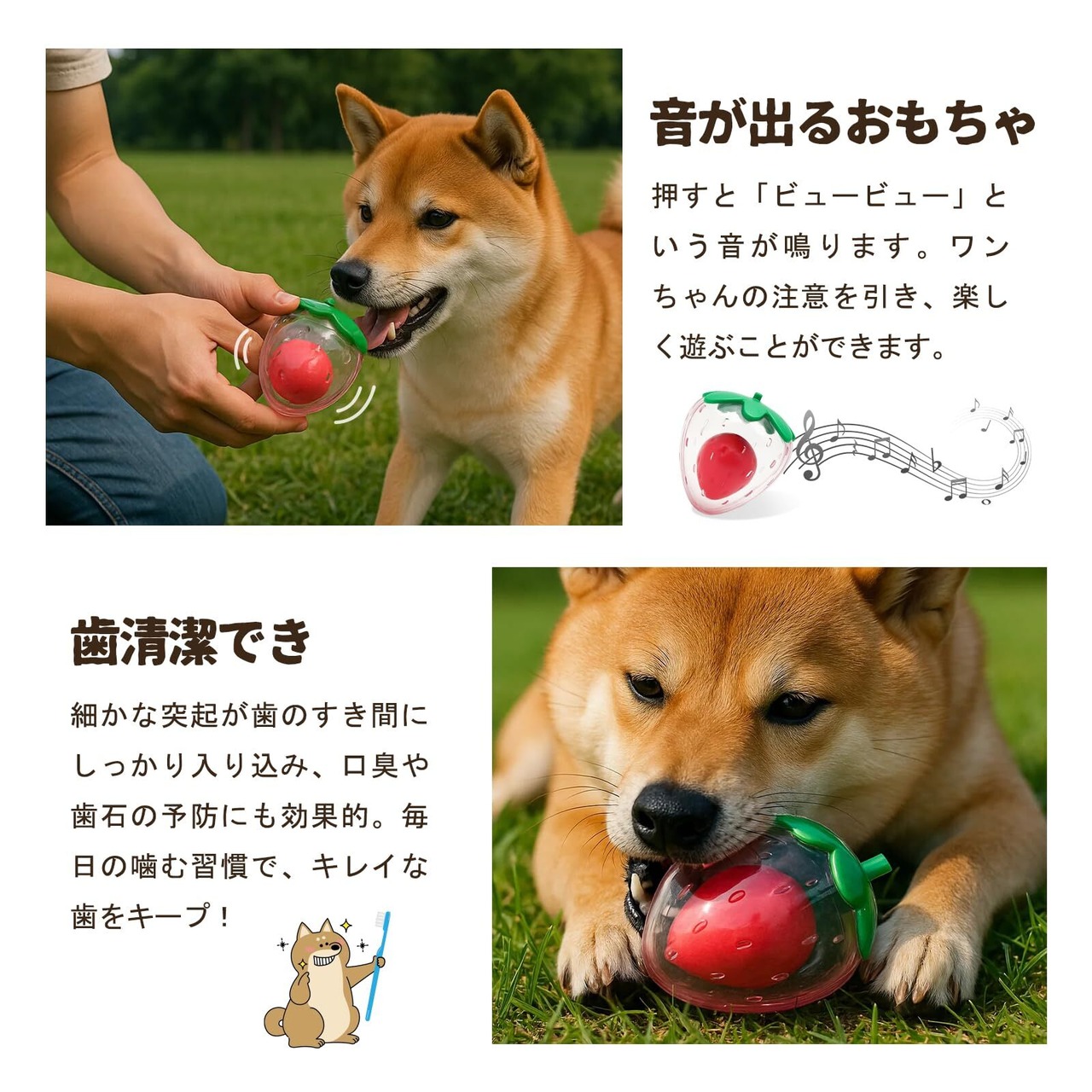 【音が出るおもちゃ】噛みやすい可愛いいちごのデザインで、噛むと音が鳴る笛も入っています。犬の注意を引くだけでなく、噛む本能を刺激し、遊びたいという熱意と欲求を高めます。留守中や飼い主さんの忙しい時に、自分でも楽しく時間を過ごせます。