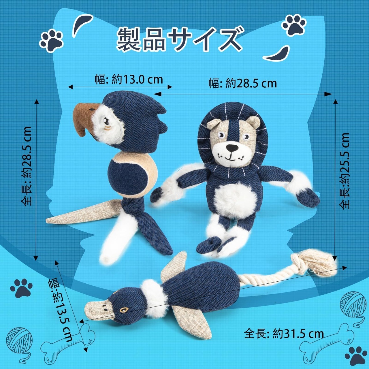 【犬 おもちゃ 3点セット】ライオン・アヒル・オウム|噛む用・音が鳴る・丈夫で壊れにくい|小型犬・中型犬向け|デニムぬいぐるみ|Calibonbon