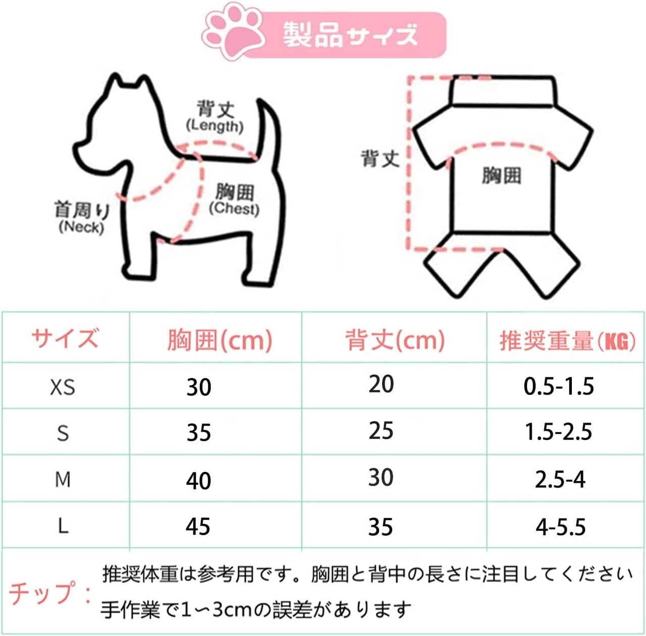 サイズ:SS:長さ20cm:バスト30cm、推奨重量0.5-1.5kg、S:長さ25cm:バスト35cm、推奨重量1.5-2.5kg、 M:長さ30cm:バスト40cm、推奨重量2.5-4kg、L:長さ35cm:バスト45cm、推奨重量4-5.5kg。購入前に測定してくださいサイズ犬。