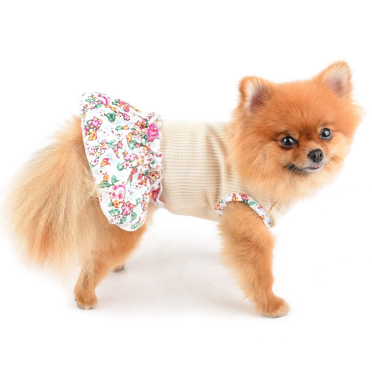 SMALLLEE_LUCKY_STORE 犬服 小型犬 春夏 ニット花柄 ワンピース お姫様 簡単着脱 女の子猫服 洋服,ベージュ,M