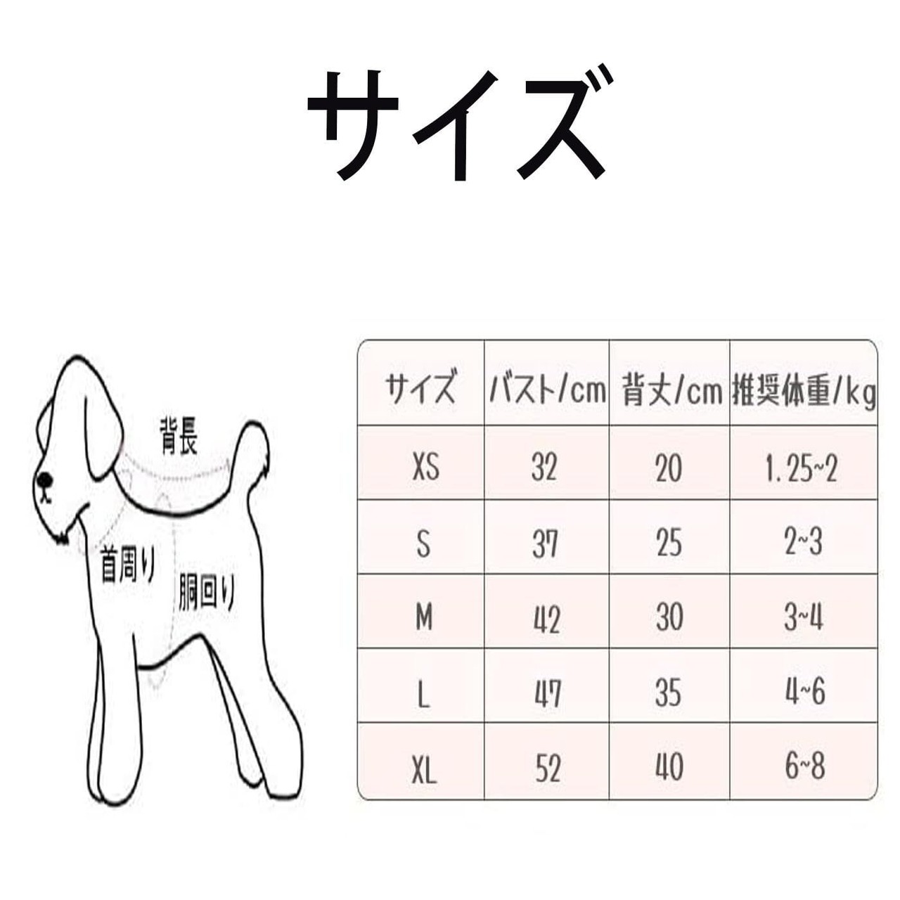 【サイズガイド】本製品はさまざまなペットのニーズに対応するために、さまざまなサイズ(xS、S、M、L、XL)を提供しています。以下に各寸法の詳細なパラメータを示します。xS:バスト:32 cm、身長:20 cm、首周り:23 cm、推奨体重:1.25-2 kg。XL:バスト:52センチ、身長:40センチ、首周り:35センチ、推奨体重:6~8キロ。ペットの実際のサイズに合わせて適切な服装を選んで、最適な着心地を確保してください