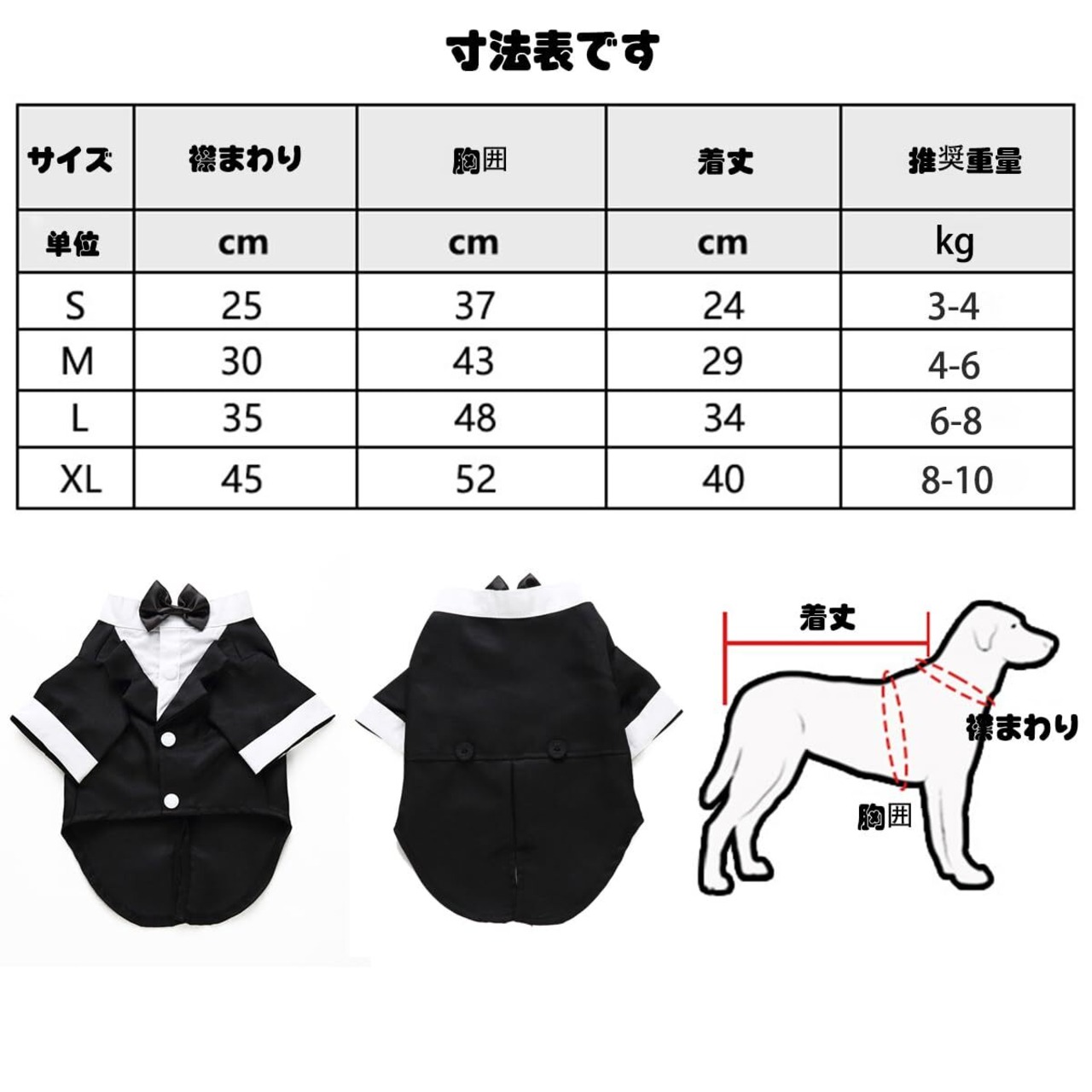 【製品情報】この犬のタキシードスーツはSサイズ:着丈24(cm)胸囲37(cm)、Mサイズ:着丈29(cm)胸囲43(cm)、Lサイズ:着丈34(㎝)胸囲48(㎝)です、XLサイズ:着丈40(㎝)胸囲52(㎝)です。 ご注文前にペットのサイズを測定してください。